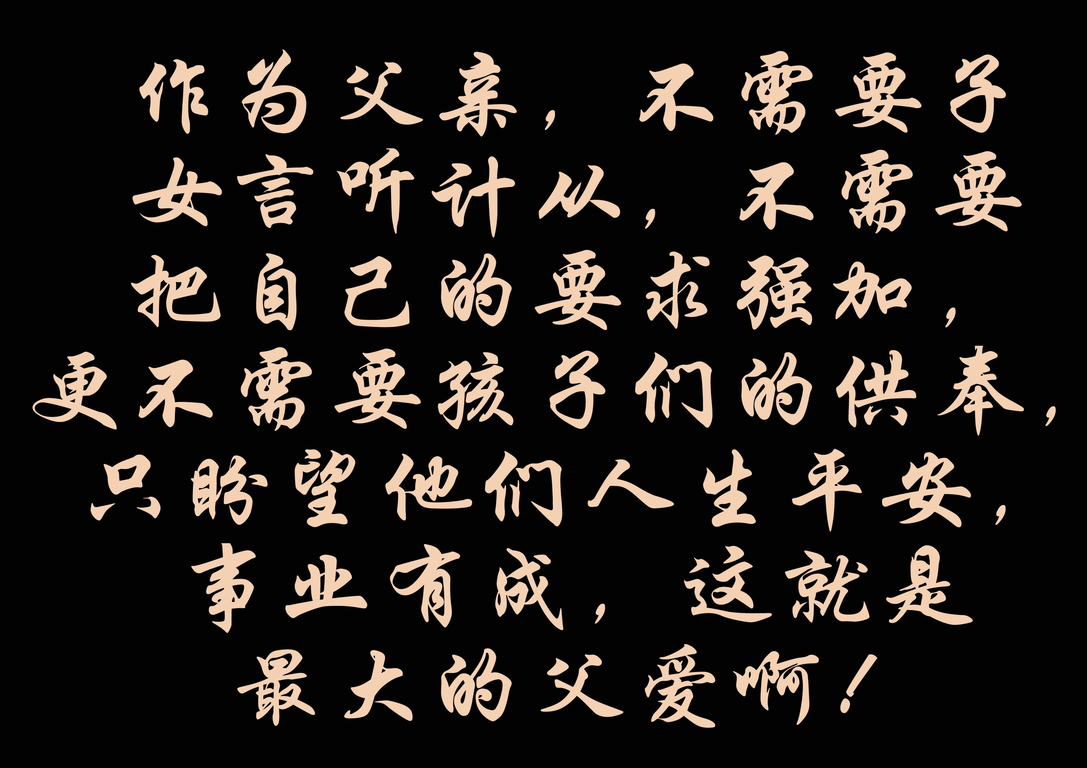 父子(zi)(zi)之間,需要(yao)(yao)互(hu)相(xiang)關心(xin),需要(yao)(yao)互(hu)相(xiang)理解,更(geng)需要(yao)(yao)實實在(zai)在(zai)的付出!作為父親,不需要(yao)(yao)子(zi)(zi)女言聽計從,不需要(yao)(yao)把自己的要(yao)(yao)求強加,更(geng)不需要(yao)(yao)孩子(zi)(zi)們的供奉,只盼望他們人生平(ping)安(an),事業有成,這就是最大的父愛啊!