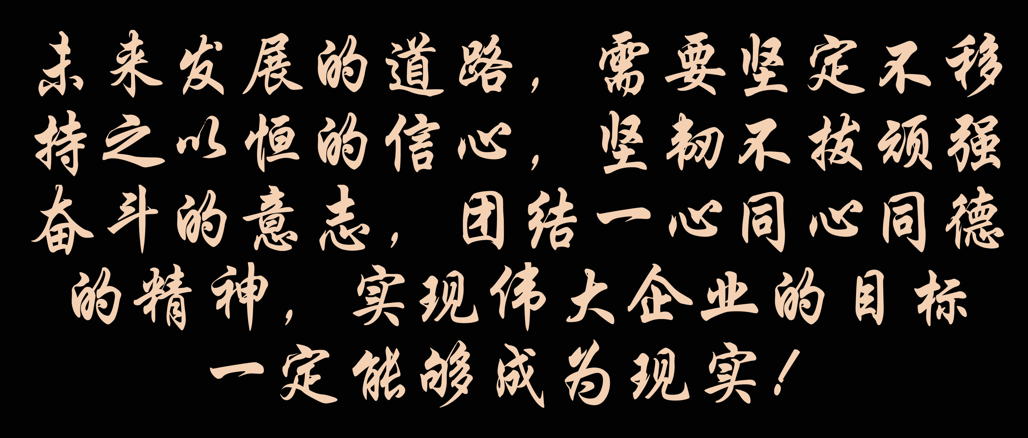 未來發(fa)展的道路,需要堅定(ding)不(bu)移(yi)持(chi)之以(yi)恒的信心(xin),堅韌不(bu)拔頑(wan)強(qiang)奮斗的意志(zhi),團結一心(xin)同心(xin)同德的精神(shen),實(shi)現偉大企業的目標一定(ding)能(neng)夠成(cheng)為(wei)現實(shi)!