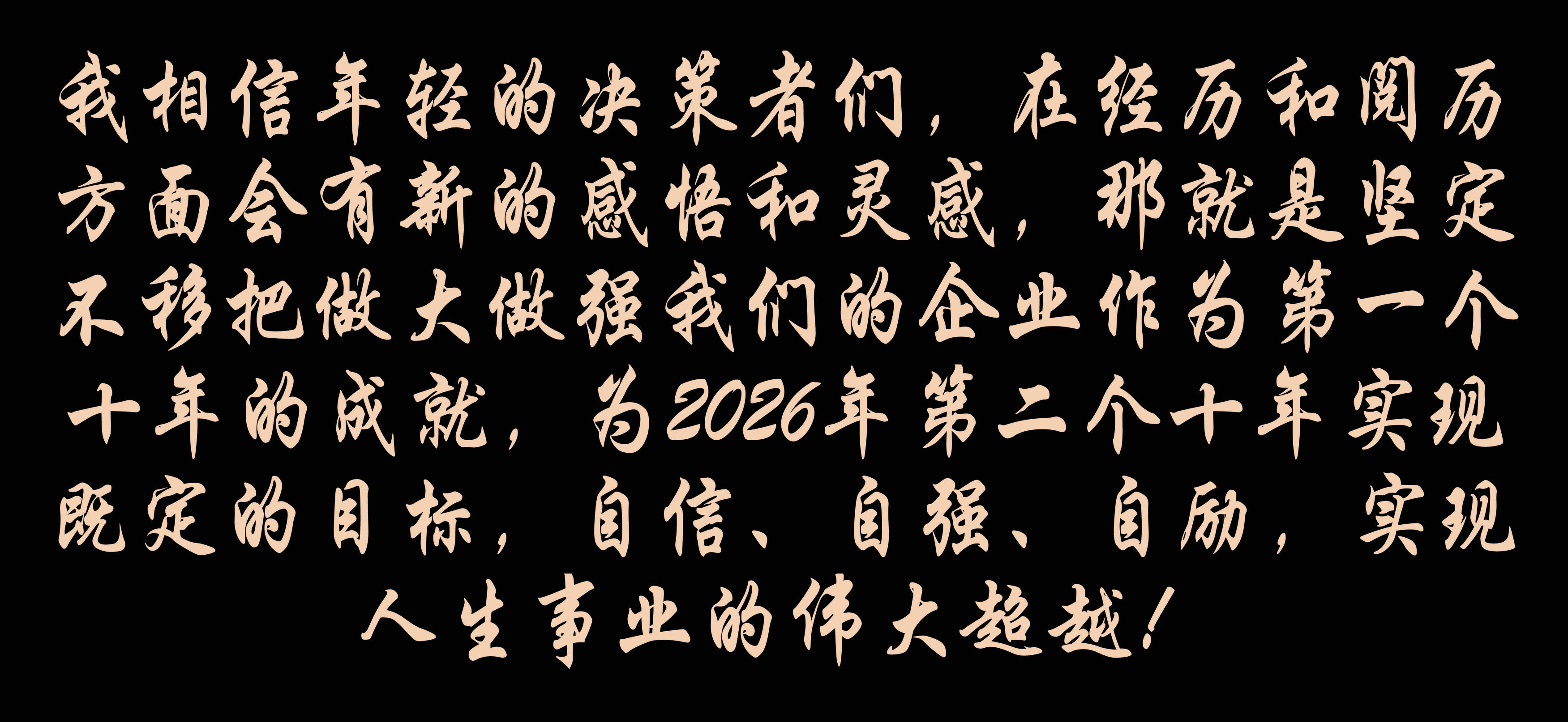 今年是山西二建第一個十年的第八年,我相信年輕的決策者們,在經歷和閱歷方面會有新的感悟和靈感,那就是堅定不移把做大做強我們的企業作為第一個十年的成就,為2026年第二個十年實現既定的目標,自信、自強、自勵,實現人生事業的偉大超越!