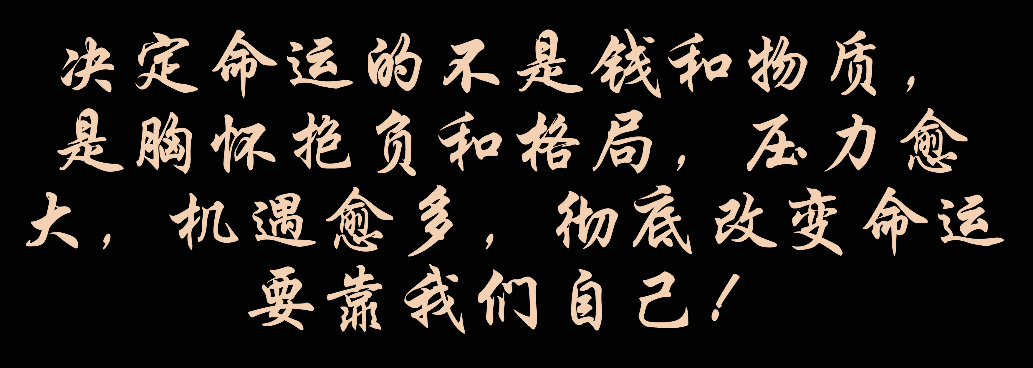苦(ku)難(nan)是(shi)(shi)成就(jiu)一切最大(da)的(de)(de)天機(ji),華恒遠需要一次改變命(ming)運(yun)的(de)(de)機(ji)遇!這(zhe)正(zheng)是(shi)(shi)我(wo)謀略未來最大(da)的(de)(de)底(di)氣,決定命(ming)運(yun)的(de)(de)不是(shi)(shi)錢和(he)物質,是(shi)(shi)胸懷抱負和(he)格局,壓力(li)愈(yu)大(da),機(ji)遇愈(yu)多,徹底(di)改變命(ming)運(yun)要靠我(wo)們自己!