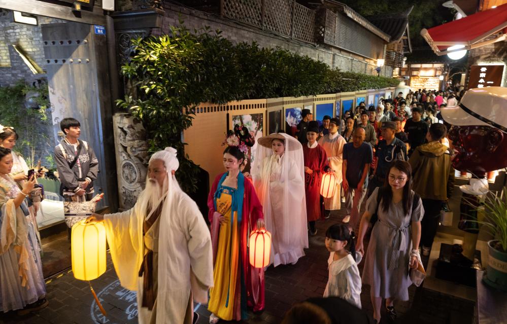9月29日(ri),在成都寬窄巷子新“十二月市”街區(qu),裝(zhuang)扮成唐宋時代人物(wu)形象的演員在巡游(you)表演。新華社記者 江宏(hong)景 攝