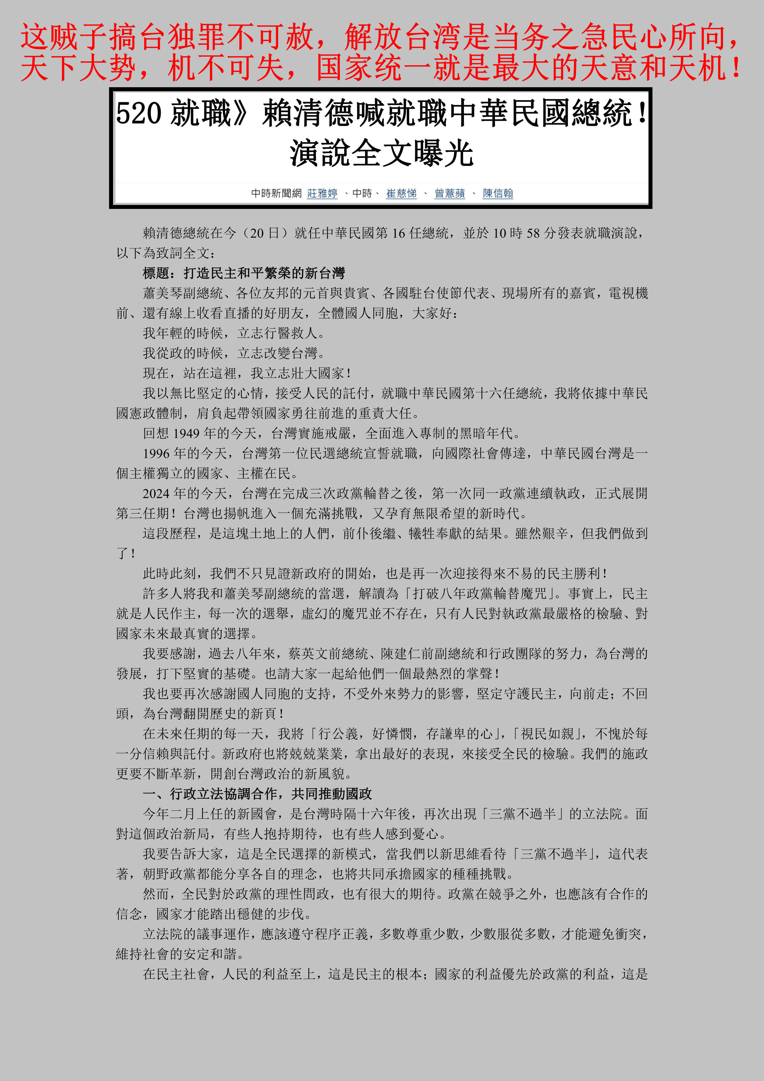 中國(guo)人民(min)(min)(包括臺(tai)灣(wan)人民(min)(min))將(jiang)絕(jue)對不能(neng)容忍(ren)美國(guo)帝國(guo)主義對臺(tai)灣(wan)或任(ren)何其他(ta)中國(guo)領土的(de)非法侵略,同(tong)樣地亦絕(jue)對不能(neng)容忍(ren)國(guo)民(min)(min)黨反動派(pai)把臺(tai)灣(wan)作(zuo)為(wei)最(zui)后掙扎(zha)的(de)根據(ju)地。中國(guo)人民(min)(min)解(jie)(jie)放斗(dou)爭的(de)任(ren)務就是解(jie)(jie)放全中國(guo),直到解(jie)(jie)放臺(tai)灣(wan)、海南島和屬于中國(guo)的(de)最(zui)后一寸土地為(wei)止(zhi)。由于中國(guo)形勢已發生巨大變化(hua),中國(guo)人民(min)(min)解(jie)(jie)放斗(dou)爭的(de)勝利一定要在不久的(de)時間內全部實現(xian)。中國(guo)人民(min)(min)一定要解(jie)(jie)放臺(tai)灣(wan),一定要解(jie)(jie)放全中國(guo)。(新華社十(shi)五日電(dian))