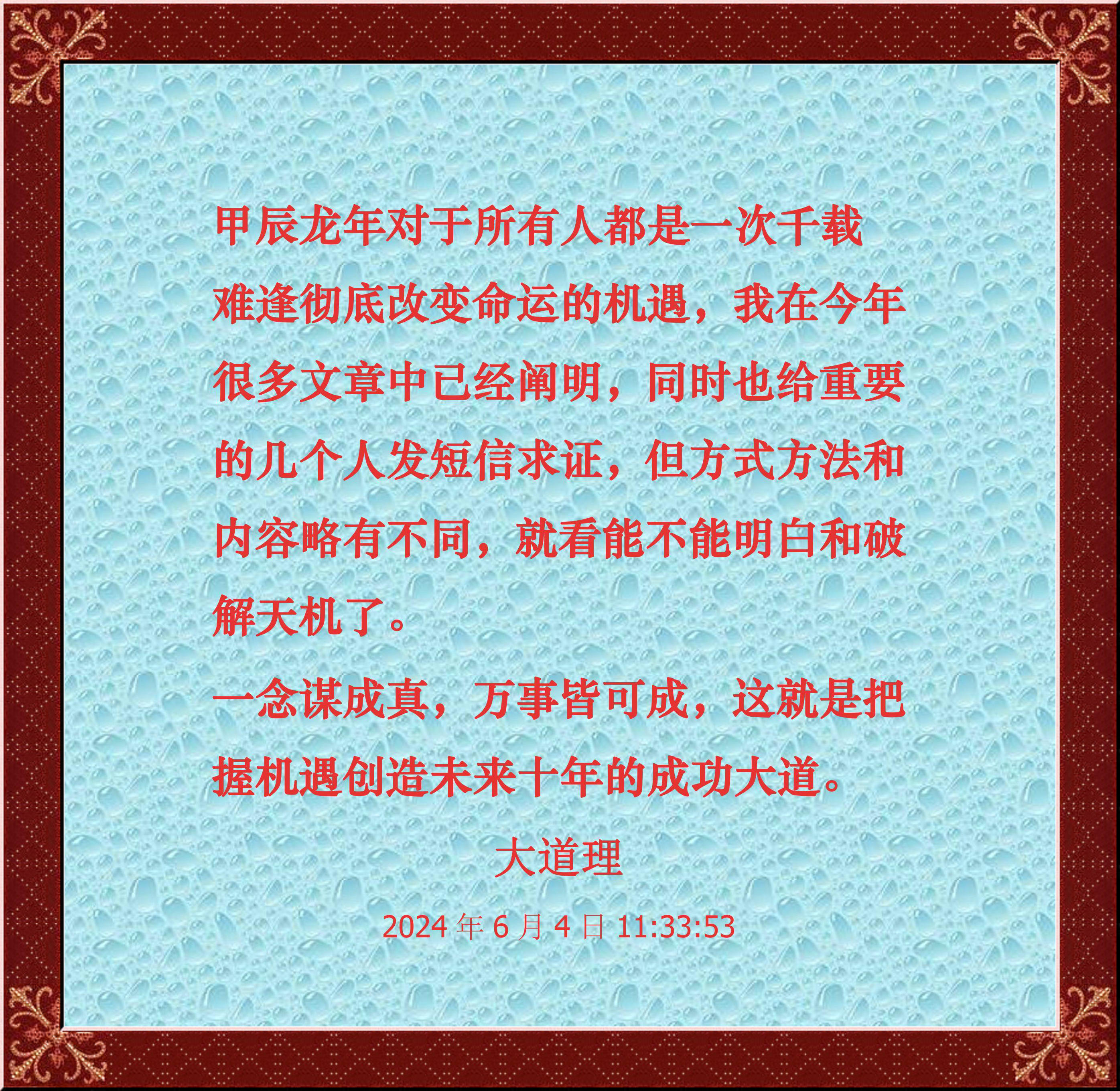 甲辰龍年對于所有人都是一次千載難逢徹底改變命運的機遇,我在今年很多文章中已經闡明,同時也給重要的幾個人發短信求證,但方式方法和內容略有不同,就看(kan)能(neng)不能(neng)明白和破解天機了(le)。