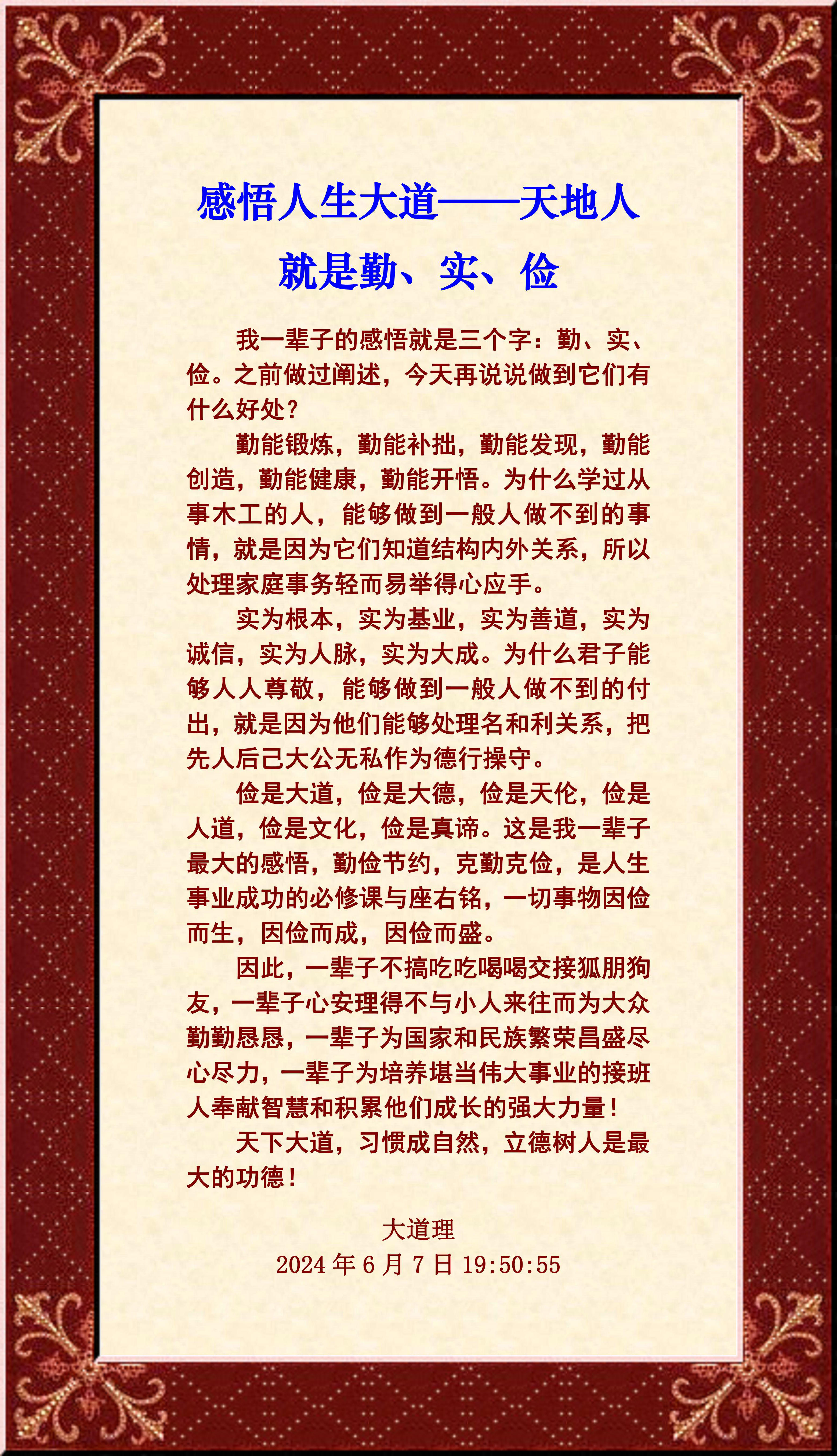 我一輩子的感悟就是三個字:勤、實、儉。之前做過闡述,今天再說說做到它們有什么好處?