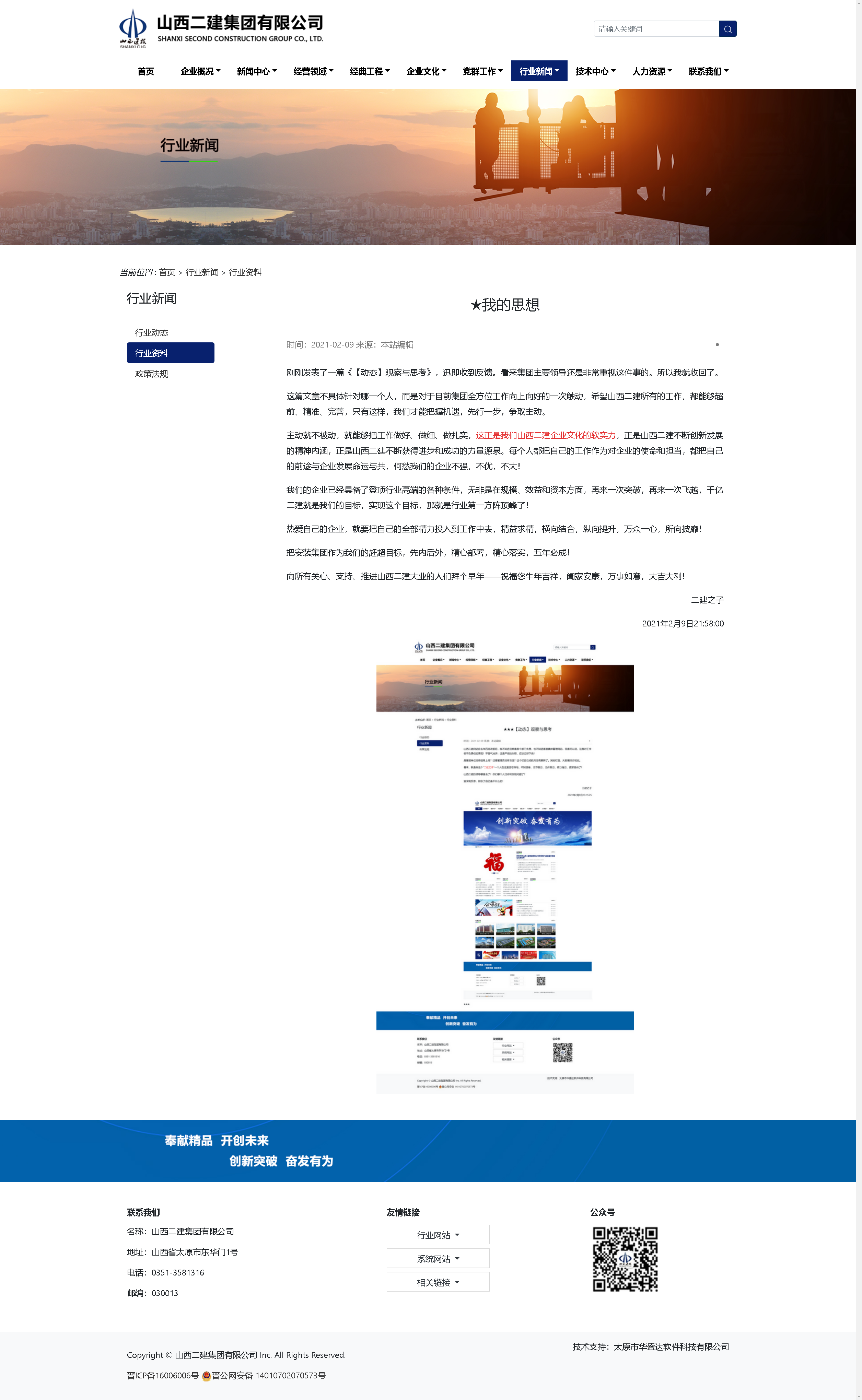 主動就不被動,就能夠把工作做好、做細、做扎實,這正是我們山西二建企業文化的軟實力,正是山西二建不斷創新發展的精神內涵,正是山西二建不斷獲得進步和成功的力量源泉。每個人都把自己的工作作為對企業的使命和擔當,都把自己的前途與企業發展命運與共,何愁我們的企業不強,不優,不大!