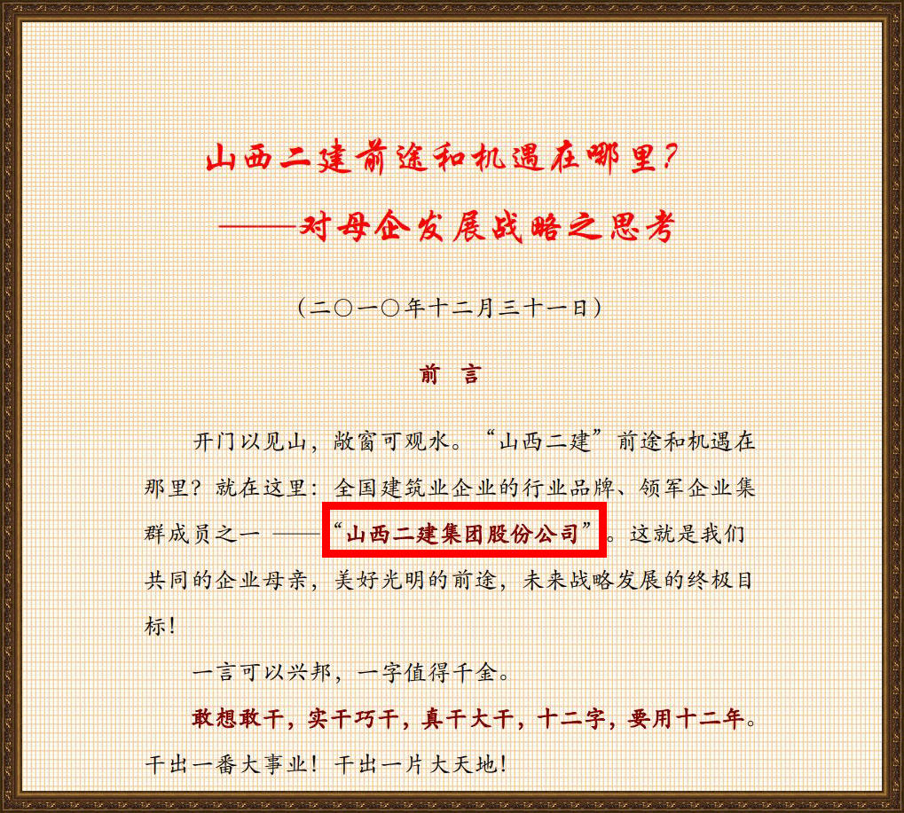 這篇文章不具體針對哪一個人,而是對于目前集團全方位工作向上向好的一次觸動,希望山西二建所有的工作,都能夠超前、精準、完善,只有這樣,我們才能把握機遇,先行一步,爭取主動。