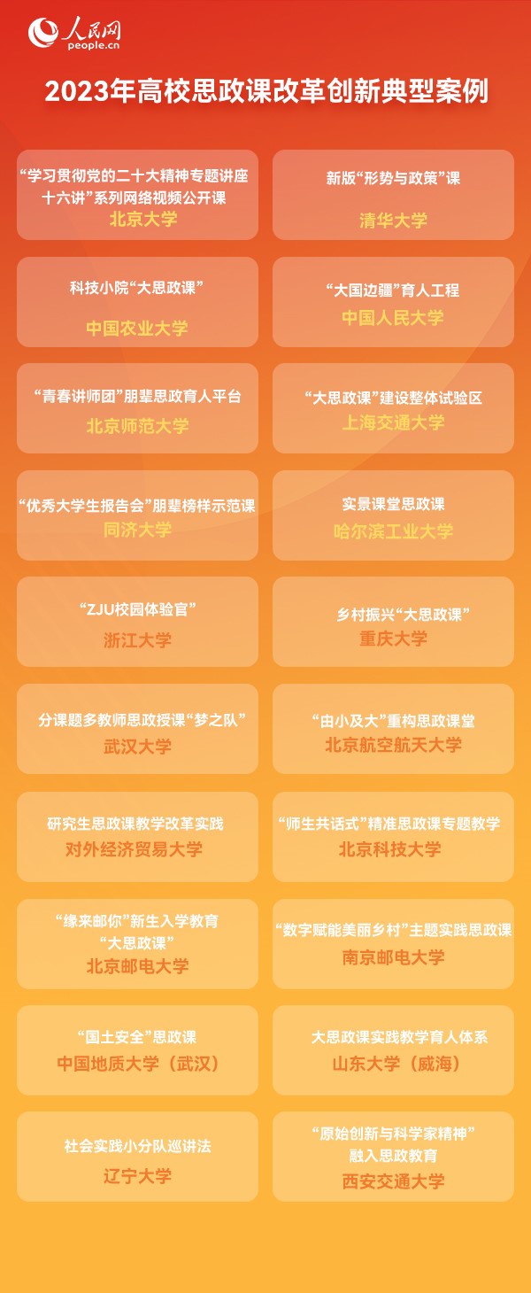 報告根據各(ge)高校思(si)政(zheng)(zheng)課(ke)(ke)程(cheng)的(de)社會反(fan)響、信息傳播量、主流媒(mei)體(ti)關注度、輿論(lun)反(fan)饋情況等維度,在全(quan)國(guo)征集推介“北京大(da)(da)(da)(da)學(xue)‘學(xue)習貫徹黨的(de)二十大(da)(da)(da)(da)精(jing)神專題(ti)講(jiang)座十六講(jiang)’系列(lie)網(wang)絡(luo)視頻公(gong)開課(ke)(ke)”“清華(hua)大(da)(da)(da)(da)學(xue)新(xin)版‘形(xing)勢與政(zheng)(zheng)策’課(ke)(ke)”“中國(guo)農業大(da)(da)(da)(da)學(xue)科技小院‘大(da)(da)(da)(da)思(si)政(zheng)(zheng)課(ke)(ke)’”“中國(guo)人民大(da)(da)(da)(da)學(xue)‘大(da)(da)(da)(da)國(guo)邊疆’育人工(gong)程(cheng)”“哈爾濱工(gong)業大(da)(da)(da)(da)學(xue)實景課(ke)(ke)堂(tang)思(si)政(zheng)(zheng)課(ke)(ke)”等20個優(you)秀思(si)政(zheng)(zheng)課(ke)(ke)程(cheng)案(an)例,以期(qi)為(wei)各(ge)高校思(si)政(zheng)(zheng)課(ke)(ke)改革創(chuang)新(xin)提供(gong)借鑒(jian)啟示。