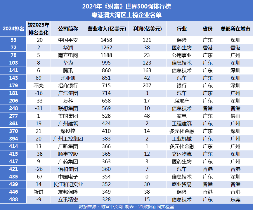 作為中國新能源汽車行業的頭部公司,總部位于深圳坪山的比亞迪是此次排名提升最多的大灣區企業。今年,這家公司的營收從上年630億美元又增加到851億美元,比上年排位提升69位。2023年比亞迪就已經排名提升最多的中國公司,排名較2022年大幅提升224位。