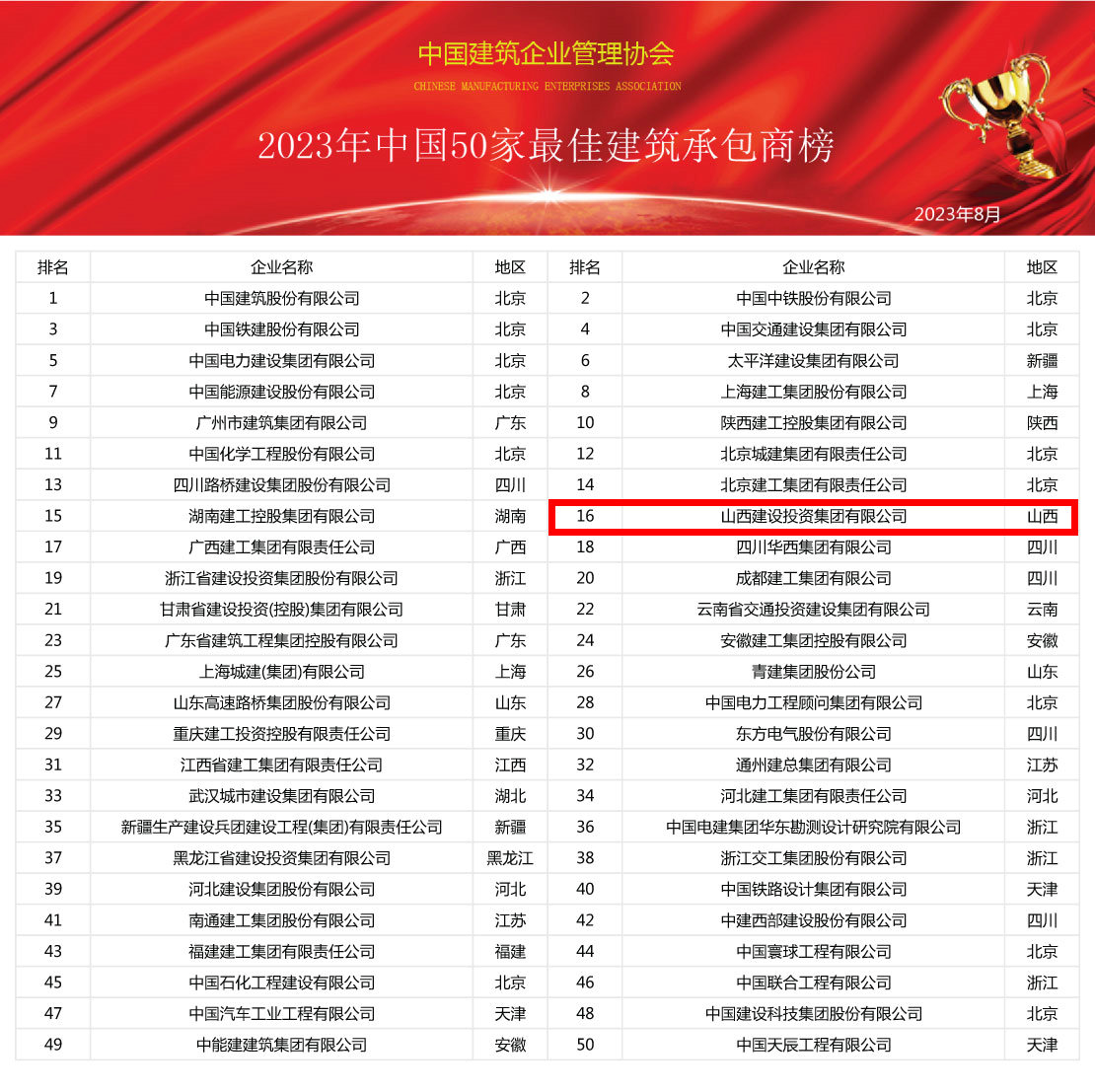 2024年中國建筑業綜合實力100強榜單的發布,不僅是對過去一年行業發展的總結,更是對未來的展望。它激勵著更多的建筑企業以百強為榜樣,不斷提升自身實力,為實現中國建筑業的高質量發展而努力奮斗。對于政府部門來說,這份榜單是了解建筑業發展態勢、制定產業政策的重要參考。對于投資者和合作伙伴來說,它是選擇優質建筑企業、開展合作的重要依據。對于廣大消費者來說,它更是放心選擇建筑產品和服務的有力保障。
