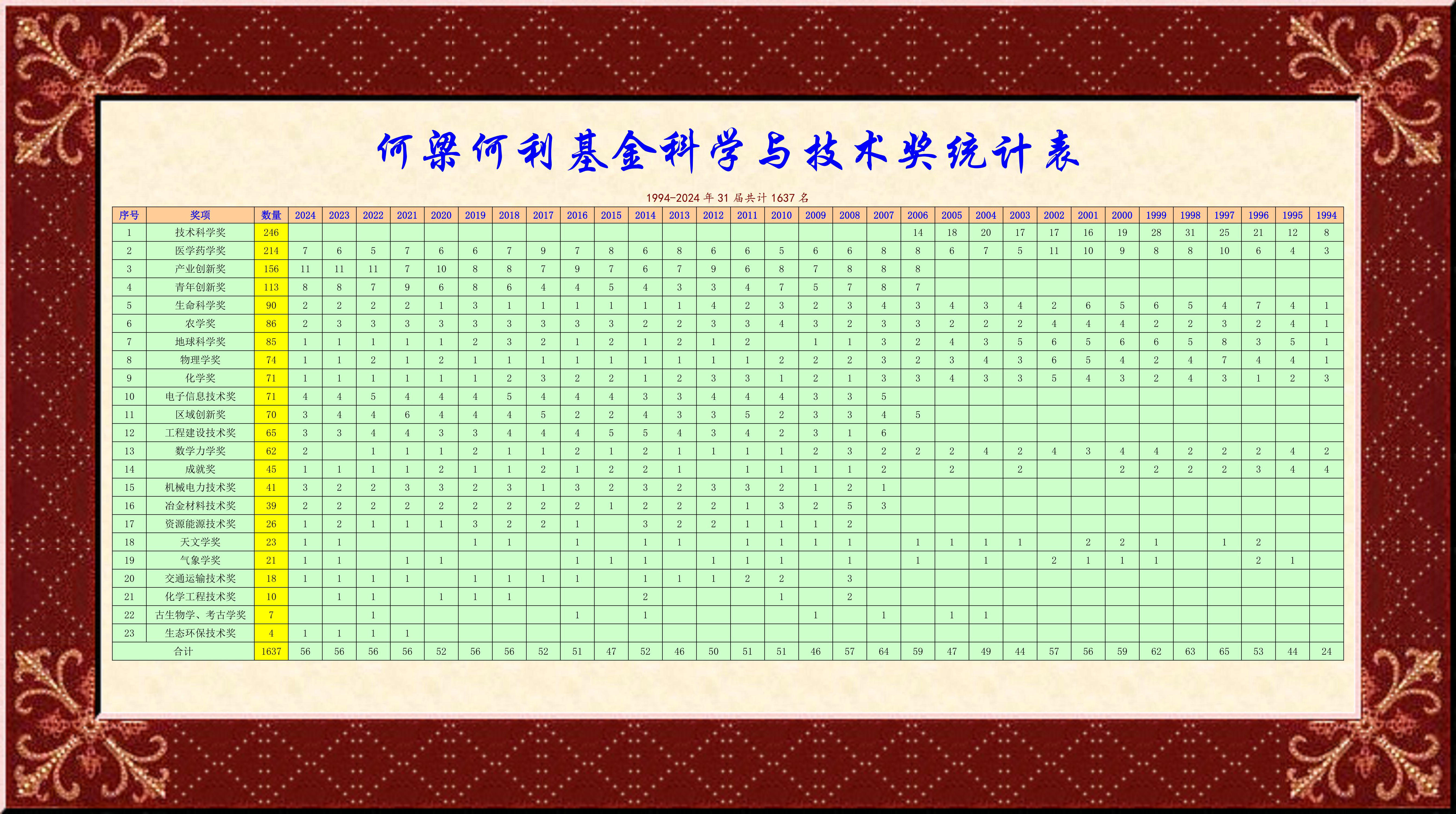 何(he)梁何(he)利基金(jin)由(you)香港愛國金(jin)融家(jia)何(he)善(shan)衡、梁銶琚、何(he)添、利國偉于1994年創(chuang)立(li),旨在(zai)獎勵(li)中國杰出科學(xue)家(jia),服務(wu)于國家(jia)現代(dai)化建設。今年(nian)是何梁何利(li)基(ji)金(jin)成(cheng)立30周年(nian),30年(nian)來共(gong)獎勵了1638位科技(ji)工作(zuo)者。