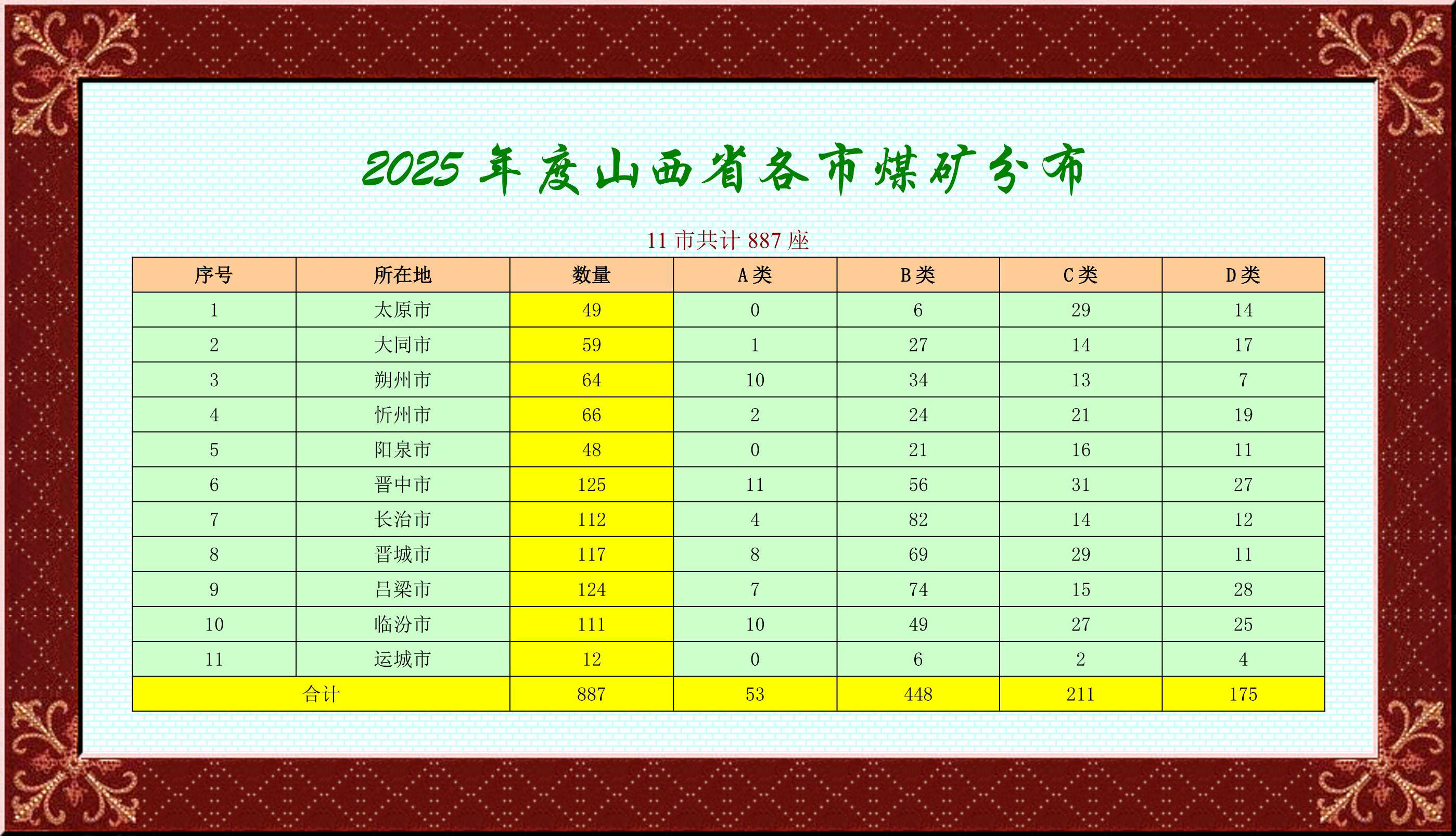 為進一步推動全省煤礦分類(lei)工(gong)作(zuo),按照省政府(fu)辦公廳《關(guan)于印發山(shan)西(xi)省煤(mei)礦(kuang)分級分類(lei)安全監(jian)管監(jian)察辦(ban)法的(de)通(tong)知(zhi)》(晉政辦(ban)發〔2020〕22 號)要(yao)求,省應急廳對各市上報的(de) 2025 年煤(mei)礦(kuang)分類(lei)情況組織開展了審(shen)核(he)、公示工作,其中 A 類(lei)煤(mei)礦(kuang) 53 座、B 類(lei)煤(mei)礦(kuang) 448 座、C 類(lei)煤(mei)礦(kuang) 211 座、D 類(lei)煤(mei)礦(kuang) 175 座。