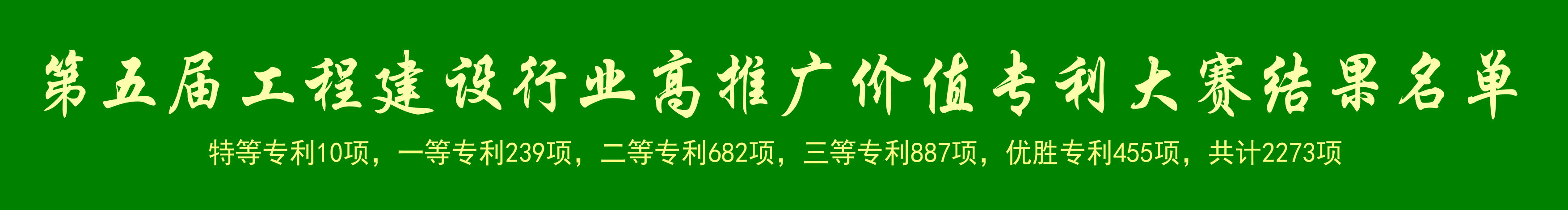 第(di)五屆工(gong)程建設(she)行業(ye)高推廣價值專(zhuan)(zhuan)(zhuan)(zhuan)利(li)(li)大賽(sai)共(gong)計征集(ji)4542項(xiang)(xiang)。經形式審查、專(zhuan)(zhuan)(zhuan)(zhuan)利(li)(li)質量(liang)評價、初賽(sai)、復賽(sai)、決賽(sai)及社會公(gong)眾投票等(deng)(deng)環節,最(zui)終(zhong)評選出特等(deng)(deng)專(zhuan)(zhuan)(zhuan)(zhuan)利(li)(li)10項(xiang)(xiang),一等(deng)(deng)專(zhuan)(zhuan)(zhuan)(zhuan)利(li)(li)239項(xiang)(xiang),二等(deng)(deng)專(zhuan)(zhuan)(zhuan)(zhuan)利(li)(li)682項(xiang)(xiang),三(san)等(deng)(deng)專(zhuan)(zhuan)(zhuan)(zhuan)利(li)(li)887項(xiang)(xiang),優(you)勝專(zhuan)(zhuan)(zhuan)(zhuan)利(li)(li)455項(xiang)(xiang)。現將名單予以公(gong)示(shi)。公(gong)示(shi)期為自(zi)公(gong)示(shi)之日起5個(ge)工(gong)作(zuo)日。