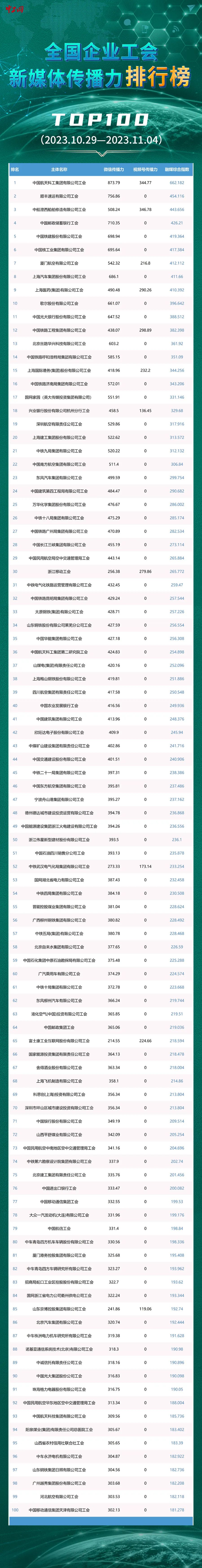 根據(ju)目前企業工會新(xin)媒體建設(she)運營實際情況,“全(quan)國企業工會新(xin)媒體傳(chuan)播(bo)力排行榜”暫定發布全(quan)國企業工會TOP100總(zong)榜單(dan)。
