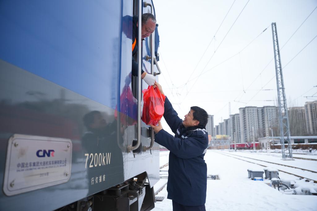 在太原火車站,工作人員將應急食品送到機車司機手中。(中(zhong)國(guo)鐵路太原局集(ji)團有(you)限公司供圖)