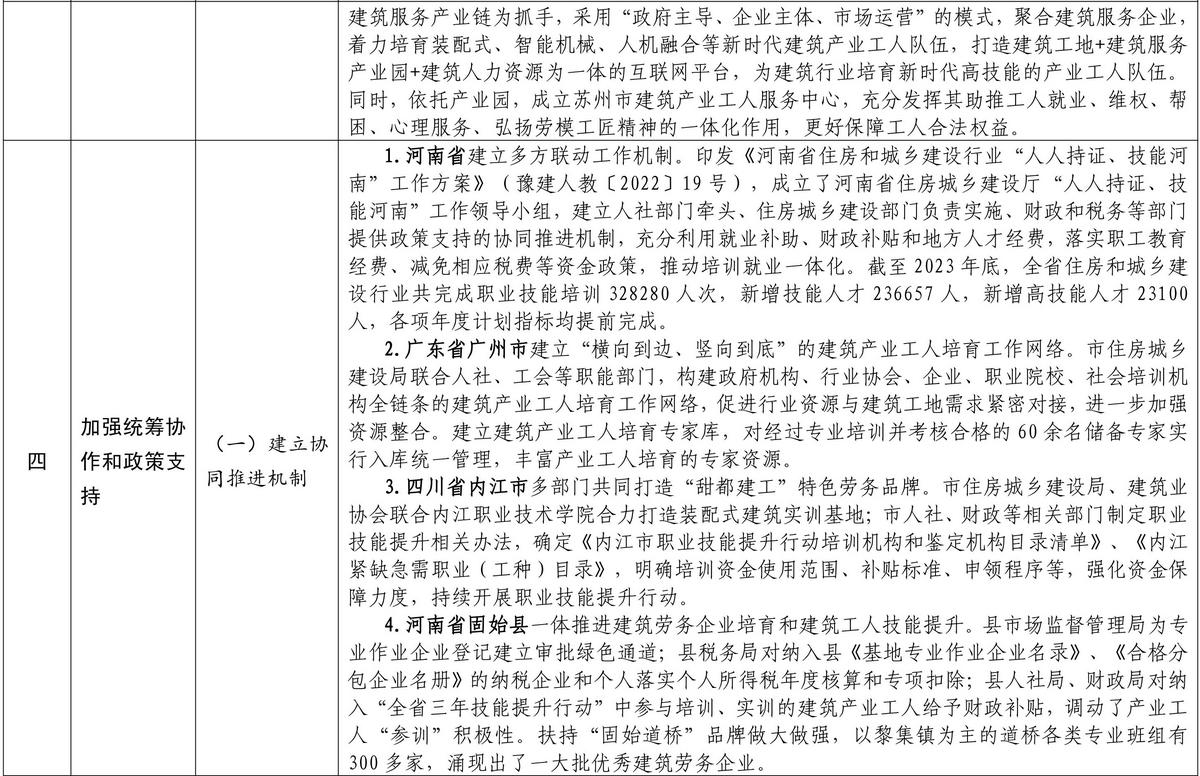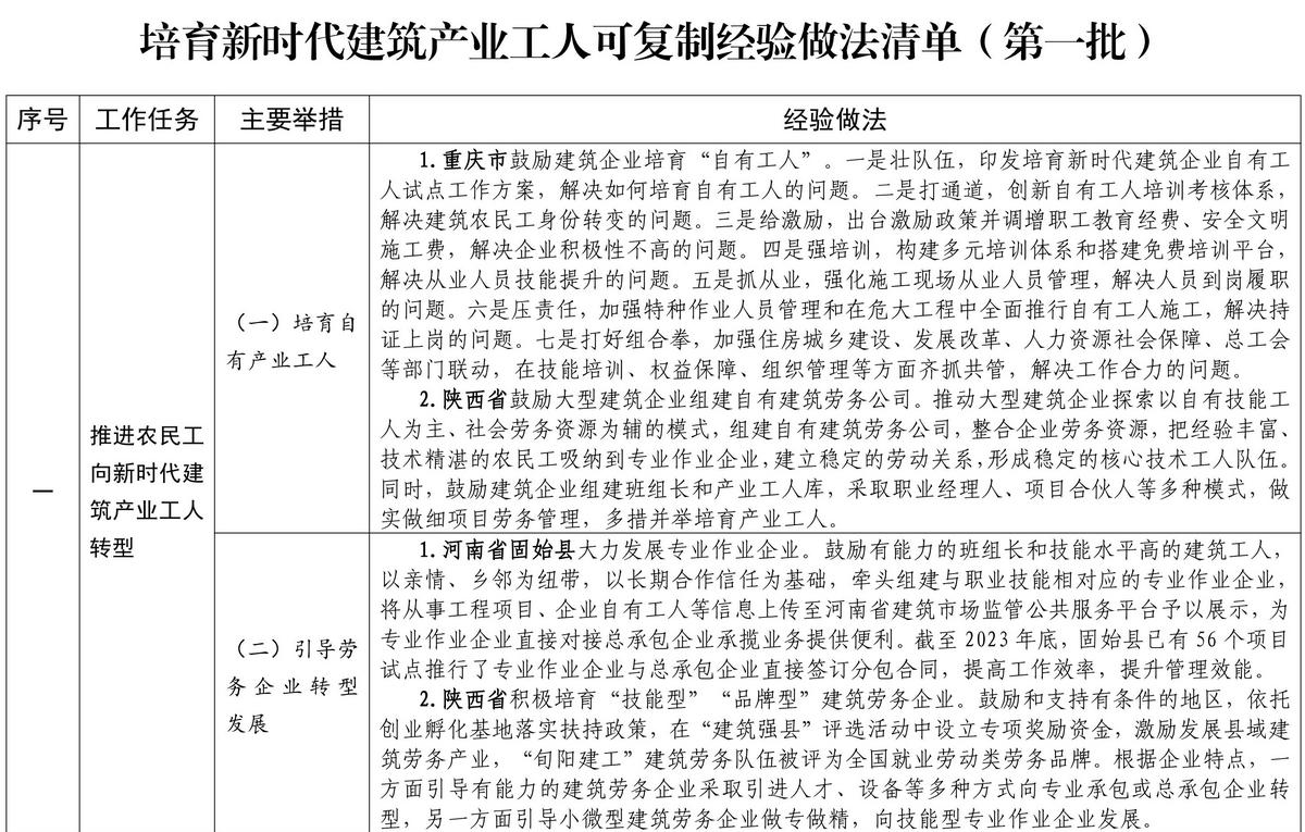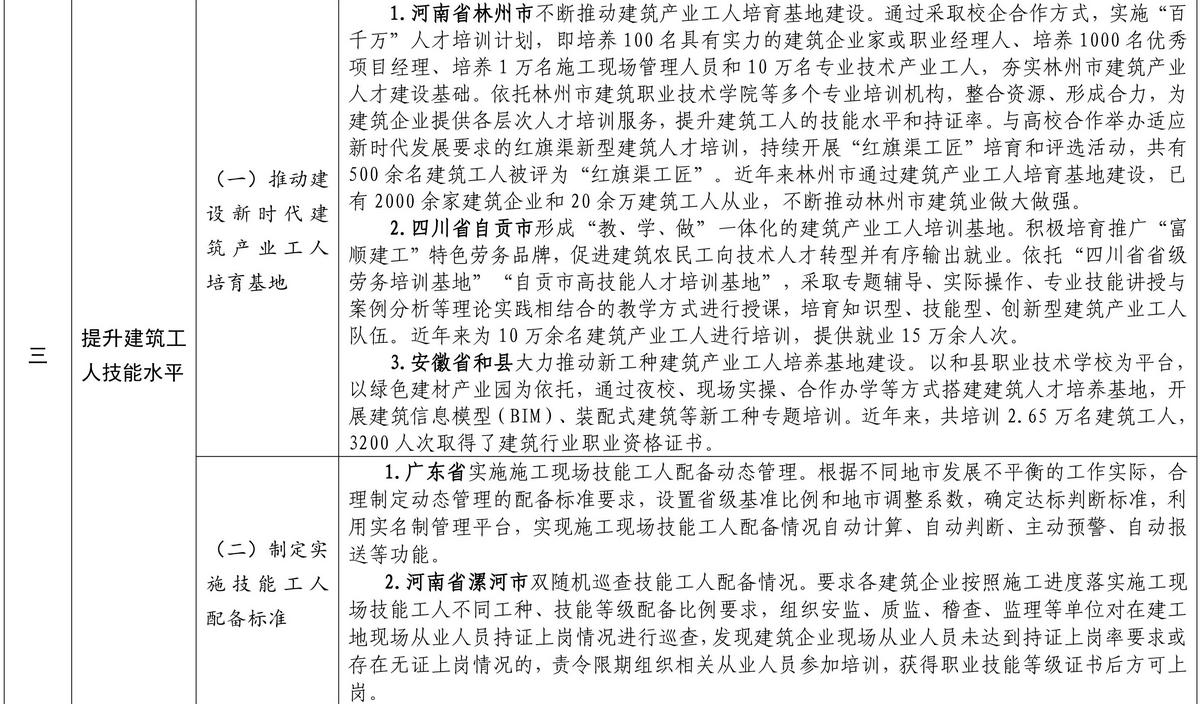 按照《》要求,各(ge)地圍繞推(tui)(tui)進農(nong)民工向新(xin)時代建(jian)筑產業工人(ren)轉型(xing)、完善(shan)建(jian)筑工人(ren)實名制管理、提升建(jian)筑工人(ren)技能(neng)水(shui)平、加(jia)強(qiang)統籌協作和政策支(zhi)持、保障(zhang)建(jian)筑工人(ren)合(he)法權(quan)益等方(fang)面,積極(ji)探索、大力推(tui)(tui)進新(xin)時代建(jian)筑產業工人(ren)隊伍建(jian)設(she),取得了積極(ji)成(cheng)效。近日,。
