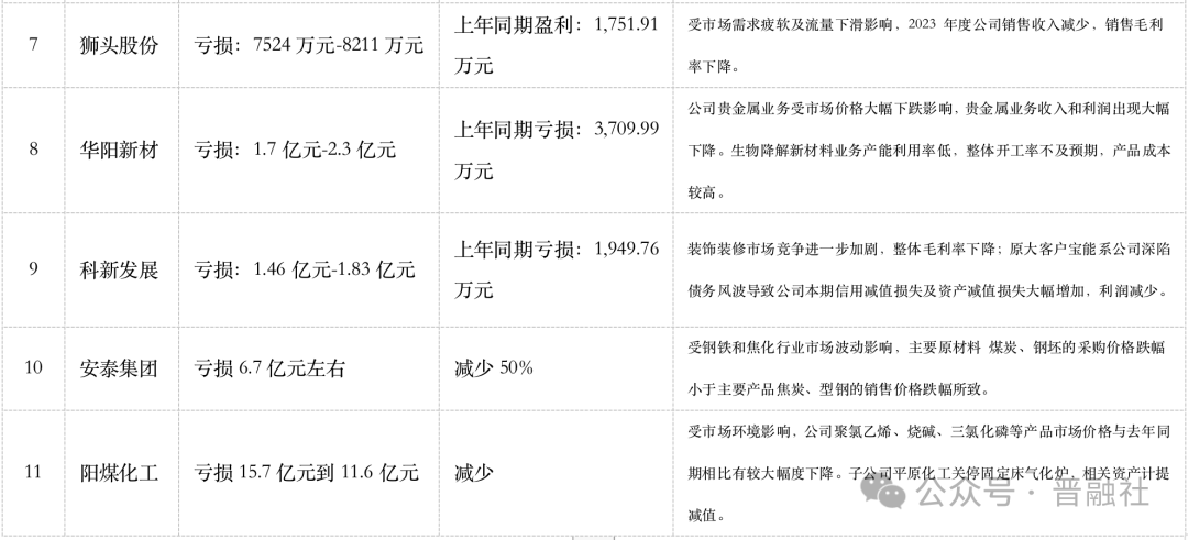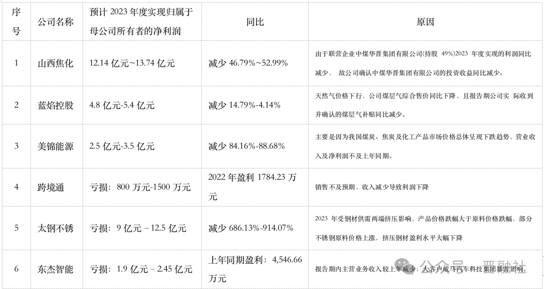 太鋼不銹預(yu)計2023年虧損9億元–12.5億元,同比減少686.13%-914.07%;美錦能源預(yu)計2023年凈利潤為2.5億(yi)元(yuan)-3.5億(yi)元(yuan),同比減少84.16%-88.68%;華陽新材預計2023年(nian)虧損1.7億元(yuan)-2.3億元(yuan),2022年(nian)虧損0.37億元(yuan)……這些企業(ye)業(ye)績下滑原因(yin)多系市場(chang)行情影響所(suo)致。
