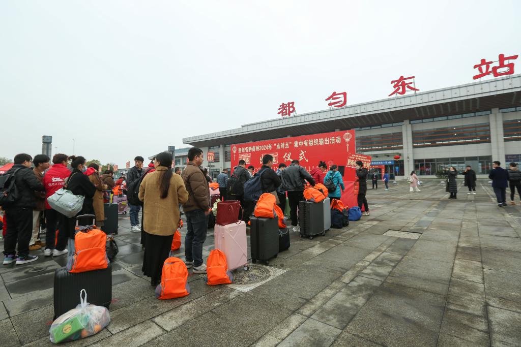 2月17日,來自(zi)貴州省黔南布依族苗族自(zi)治州各縣市的返崗務(wu)工人(ren)員在都勻東(dong)站(zhan)廣場(chang)等待進(jin)站(zhan),準備乘坐返崗務(wu)工專列。新華(hua)社發(肖偉 攝)