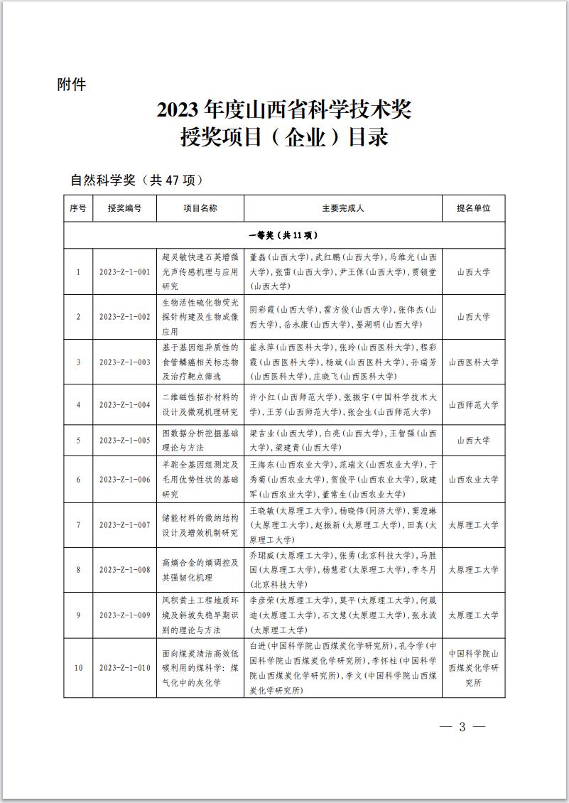 根據《山西省科學技術獎勵辦法》的規定,經省科學技術獎勵評審委員會評審、省科學技術獎勵委員會審定,省政府批準,授予“非經典光源制備關鍵技術及應用”和“煤基固廢中鋰鋁戰略資源高值利用的關鍵技術及應用”2個項目特等獎,授予“超靈敏快速石英增強光聲傳感機理與應用研究”等35個項目一等獎,授予“剪切/振動耦合超常動態凝固理論與方法”等158個項目二等獎,授予“山西航天清華裝備有限責任公司”等6家單位企業技術創新獎。