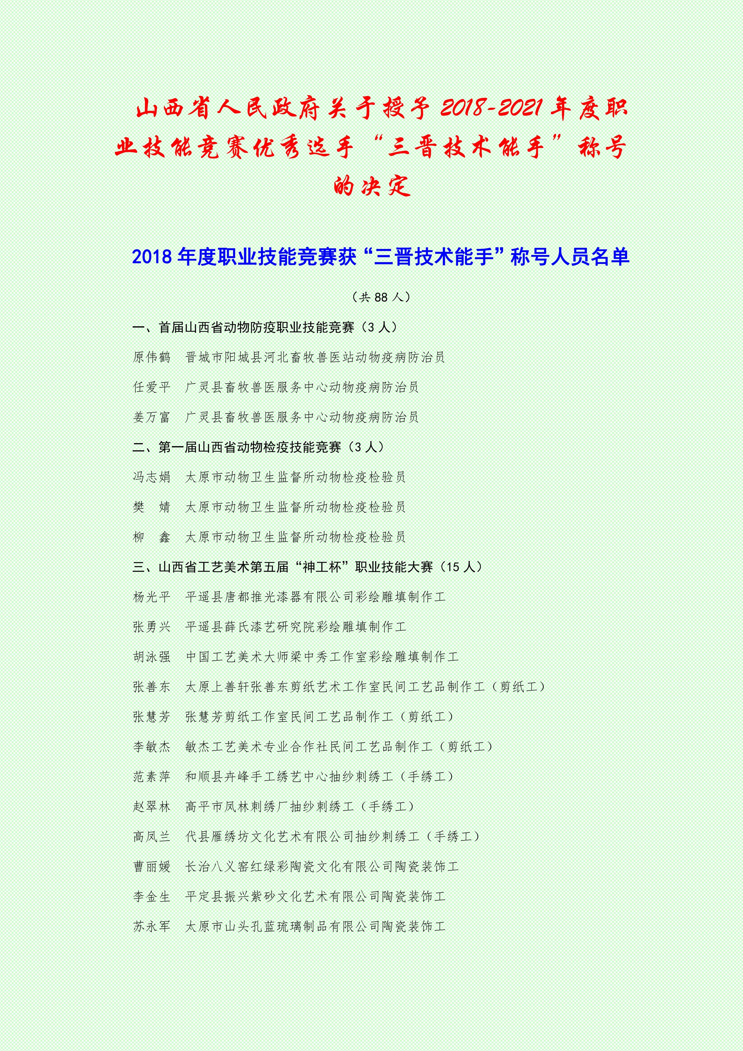 2018-2021山西省建筑業企業獲職業技能競賽“三晉技術能手”稱號名單