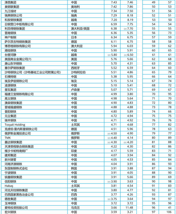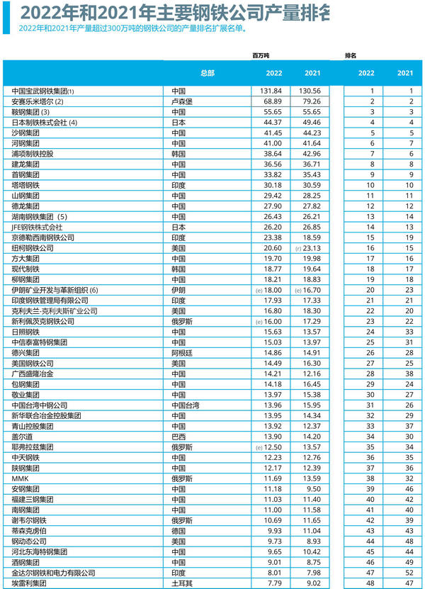 2022年主要鋼鐵公司產量排名