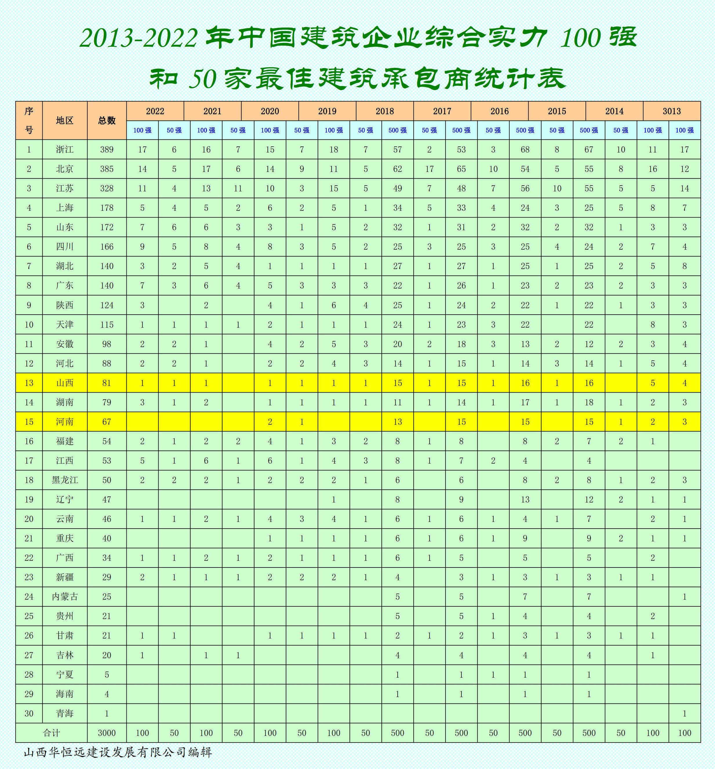 2013-2022年中國建筑企(qi)業綜合實力100強和50家最佳建筑承(cheng)包商排行榜