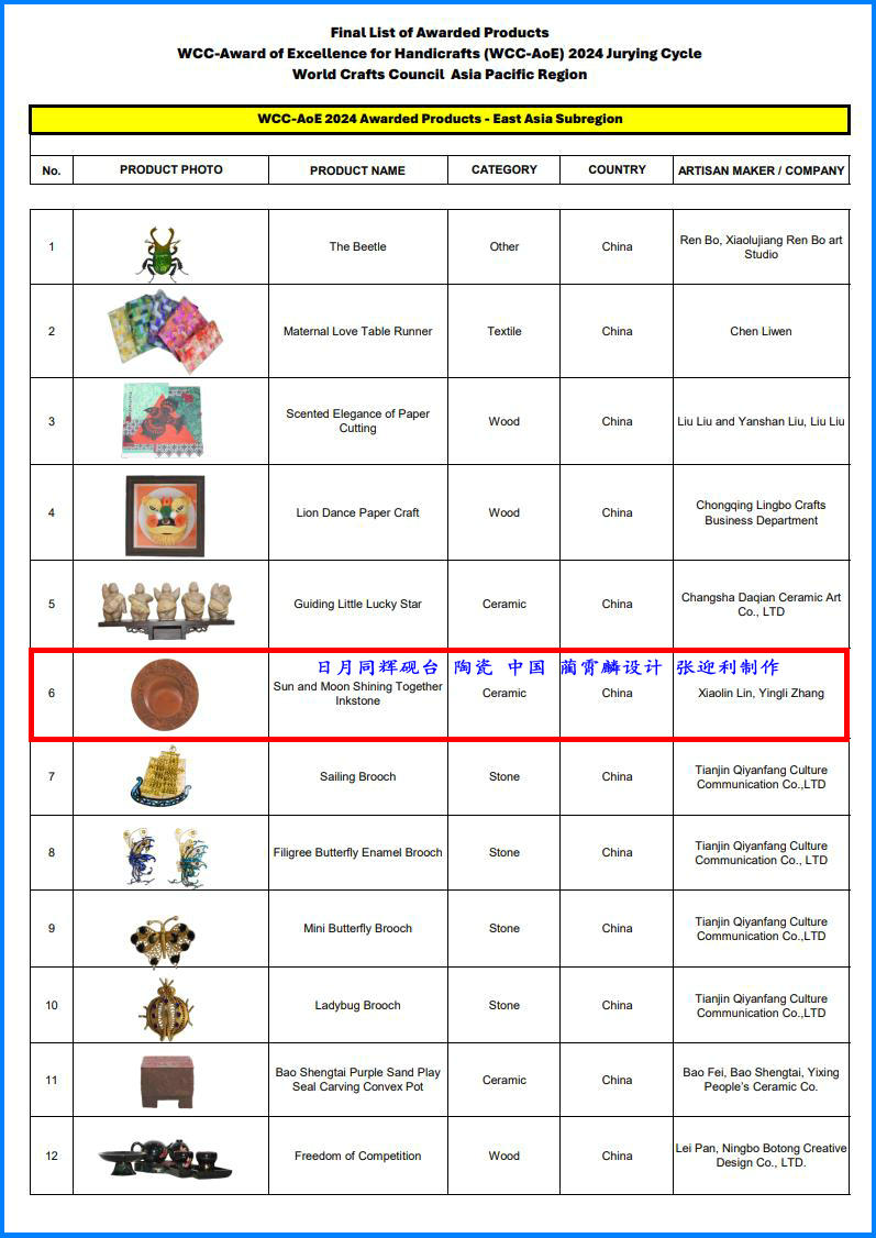 “世界杰出手工藝品徽章”是世界手工藝行業的最高榮譽。“日月同輝硯”的設計者藺霄麟是國家級非遺絳州澄泥硯第三代傳承人(市級)、中國文房四寶行業青年之星、山西省陶瓷藝術大師、運城市工藝美術大師;張迎利則為國家級非遺絳州澄泥硯傳承人、澄泥硯雕刻技術能手。