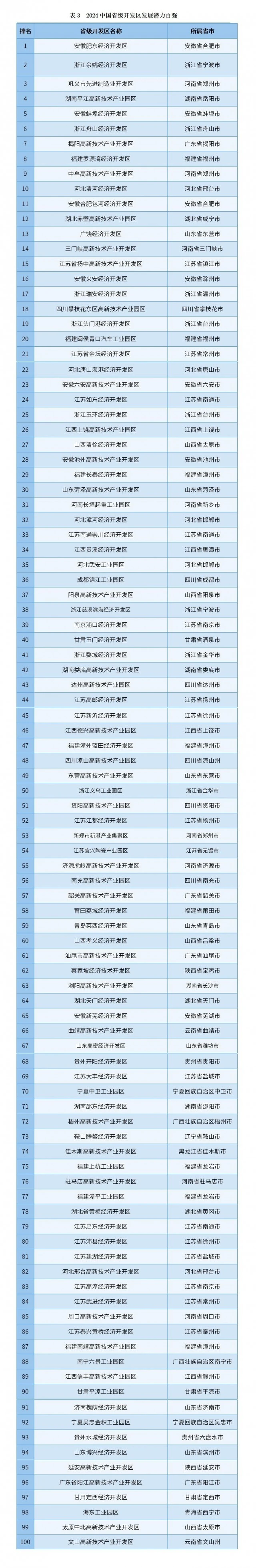 最后,報告(gao)根據(ju)上述指標體系,結合區域發(fa)展實際,遴選了各省份發(fa)展勢頭(tou)較(jiao)好、發(fa)展潛力(li)較(jiao)大的省級開(kai)(kai)發(fa)區,發(fa)布了“2024中國省級開(kai)(kai)發(fa)區發(fa)展潛力(li)百強”(表3)。