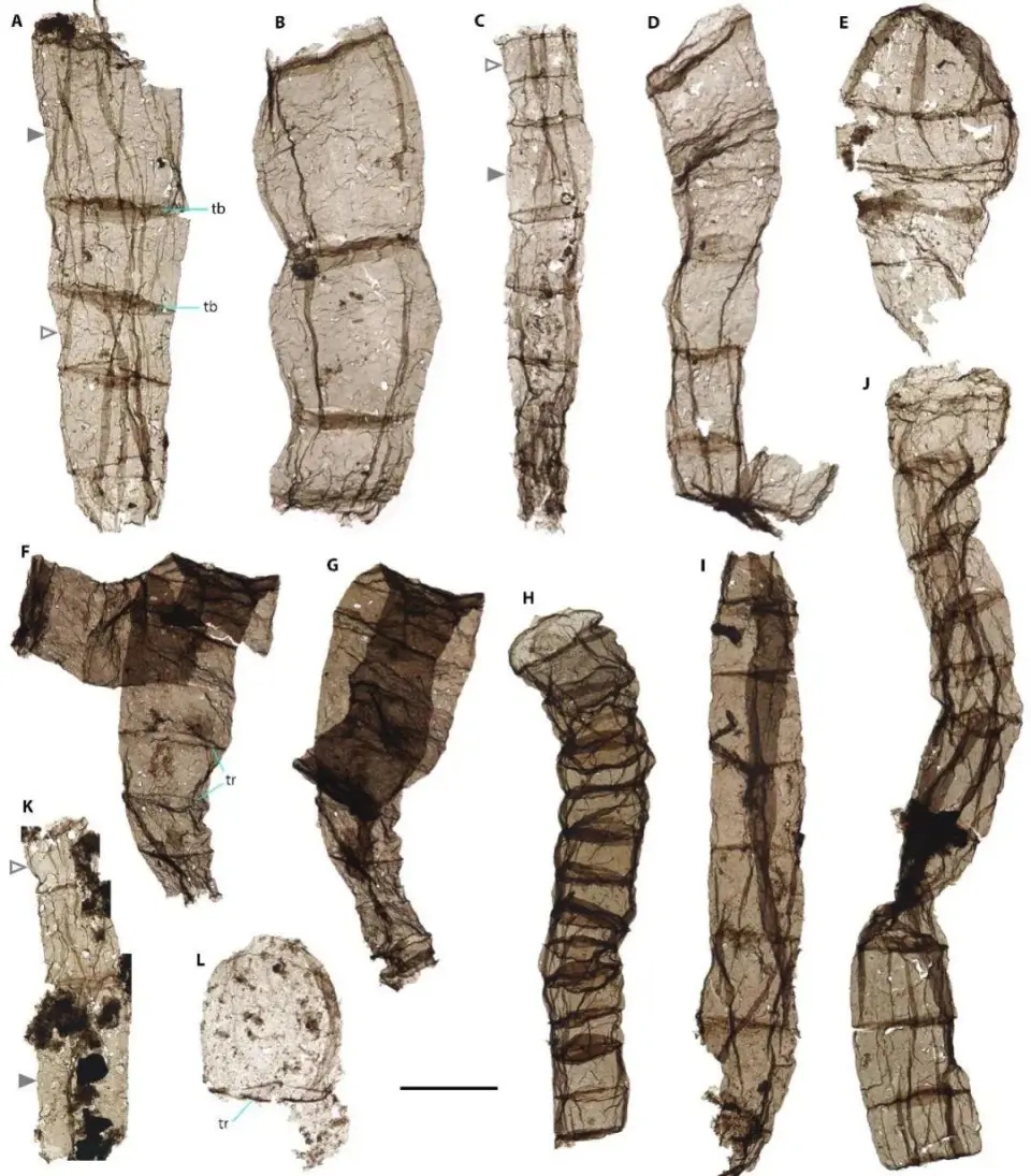 ▲串嶺溝組中發現的壯麗青山藻。化石保存為有機質壁構成的多細胞絲狀體,顯示細胞大小和形態的變化引起的絲狀體形態變化。絲狀體直徑向一端收縮(A-D、F-I、K),絲狀體直徑不變(J),保存有完整端部的絲狀體(E、L)。比例尺對于F-H和K代表100微米,其余的代表50微米。