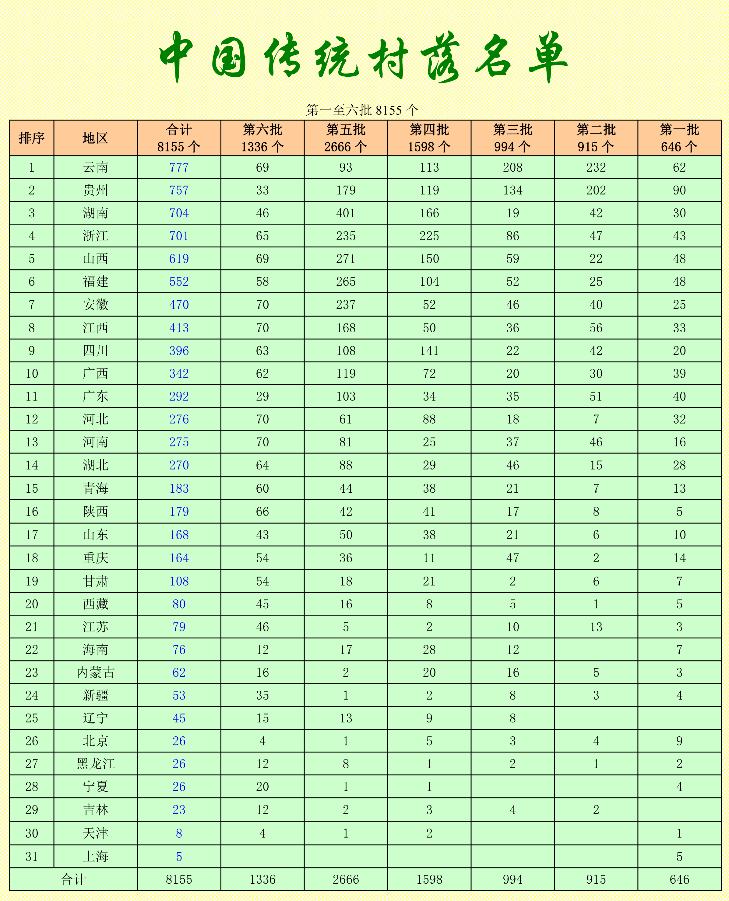 2012年以來,住房和城鄉建設部會同有關部門分六批將8155個村落列入中國傳統村落保護名錄,山西就有619個,數量位居全國第5位。從現存的傳統村落來看,山西已成為北方漢民族地區傳統村落數量最多、風貌最完整、集聚度最高、類型最豐富的省份。