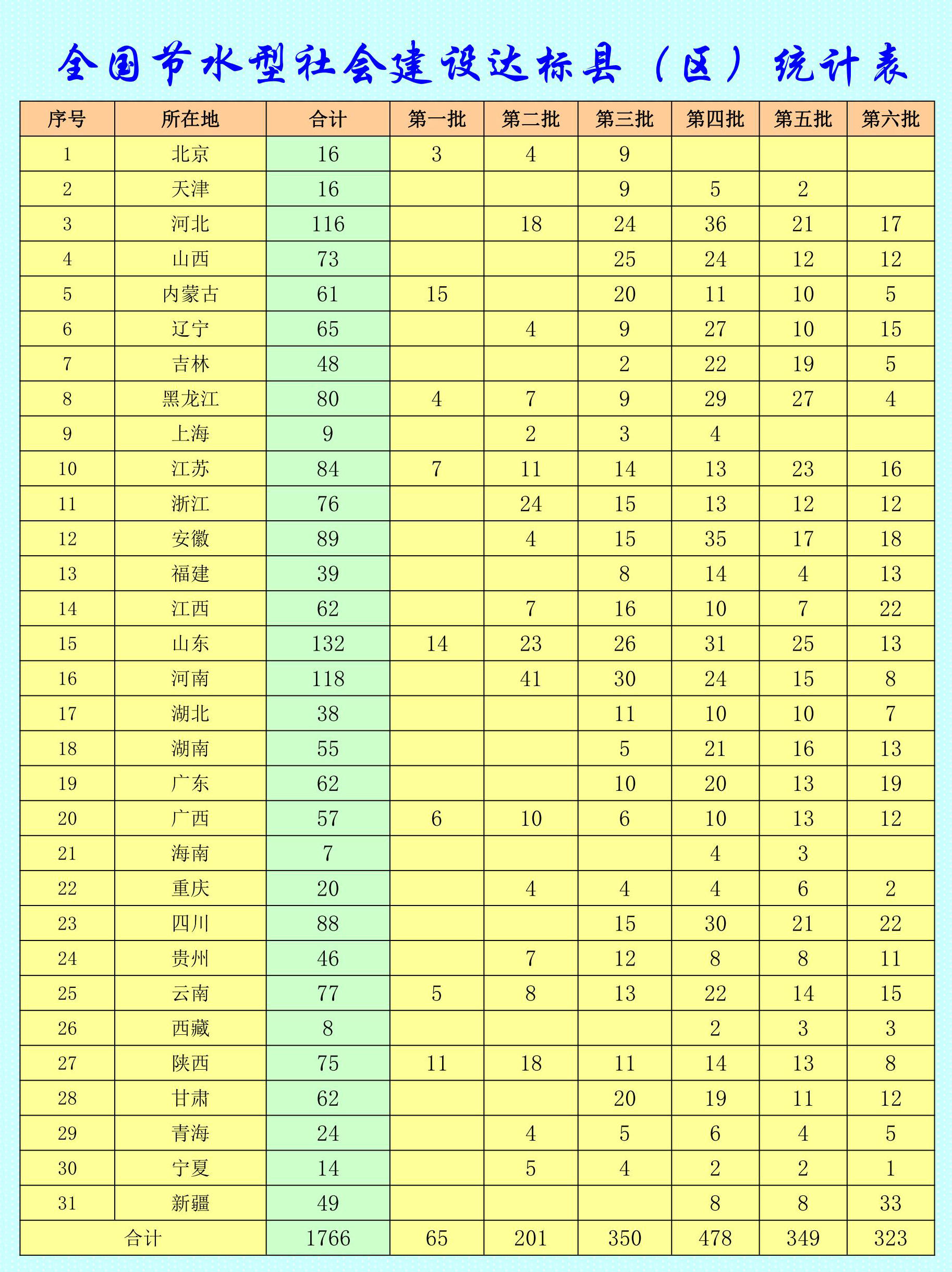 本報北京10月16日電 (記者王浩)近日,,將河北省大城縣等323個縣(區)命名為節水型社會建設達標縣(區)。目前,全國已累計創建6批共1766個達標縣(區),超額完成目標任務。其中,黃河流域9個省份建成647個達標縣(區)、建成率達67%。