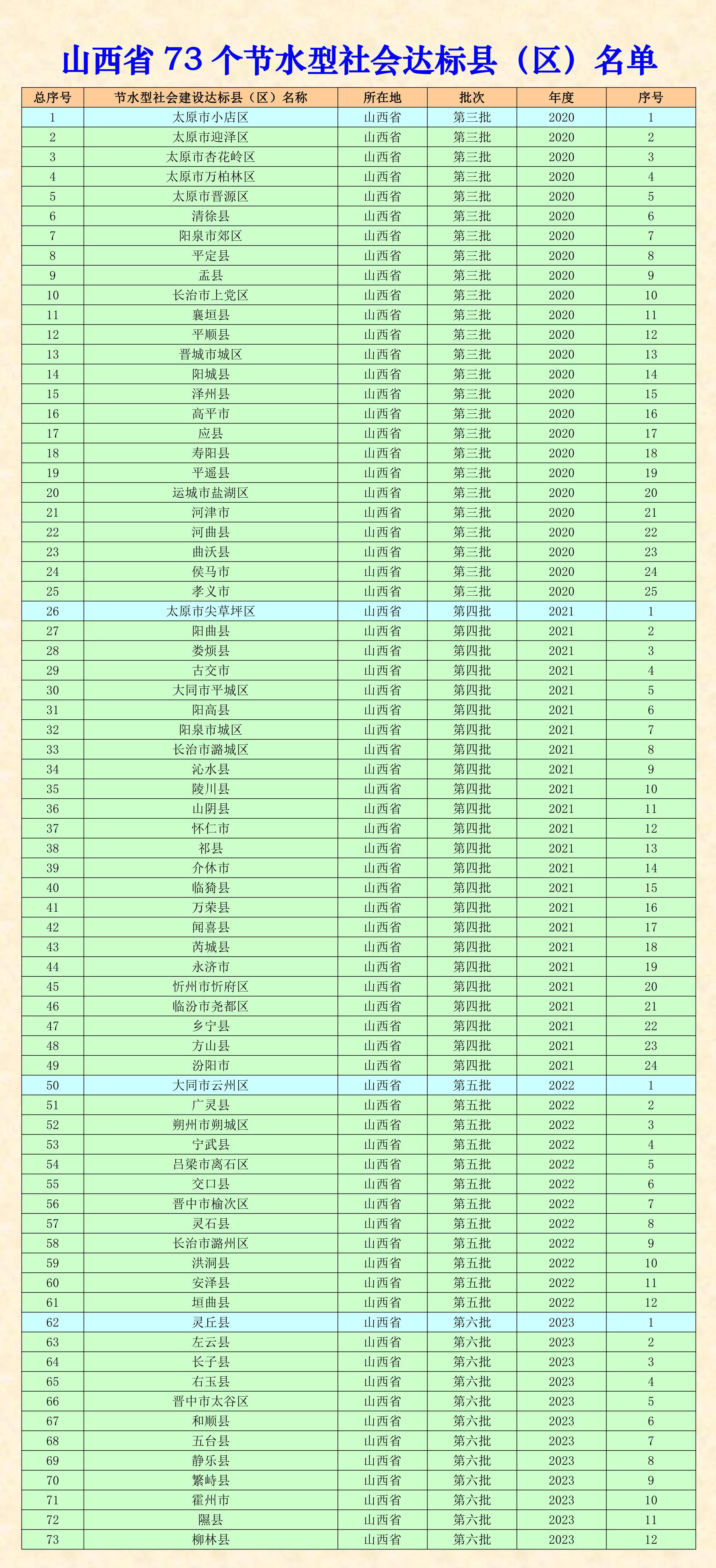 山西日報記者范珍報道 10月17日,記者獲悉,水利部于近日公布第六批節水型社會建設達標縣(區)名單,我省大同市靈丘縣、左云縣、長治市長子縣、朔州市右玉縣、晉中市太谷區、和順縣、忻州市五臺縣、靜樂縣、繁峙縣、臨汾市霍州市、隰縣、呂梁市柳林縣12個縣(區)在列。截至目前,我省已有73個縣(區)先后被水利部命名為節水型社會達標縣,達標縣命名率達到62.3%,提前達到了國家《十四五節水型社會規劃》中要求的:到2025年底,北方地區60%以上縣(區)級行政區達到節水型社會標準的目標。