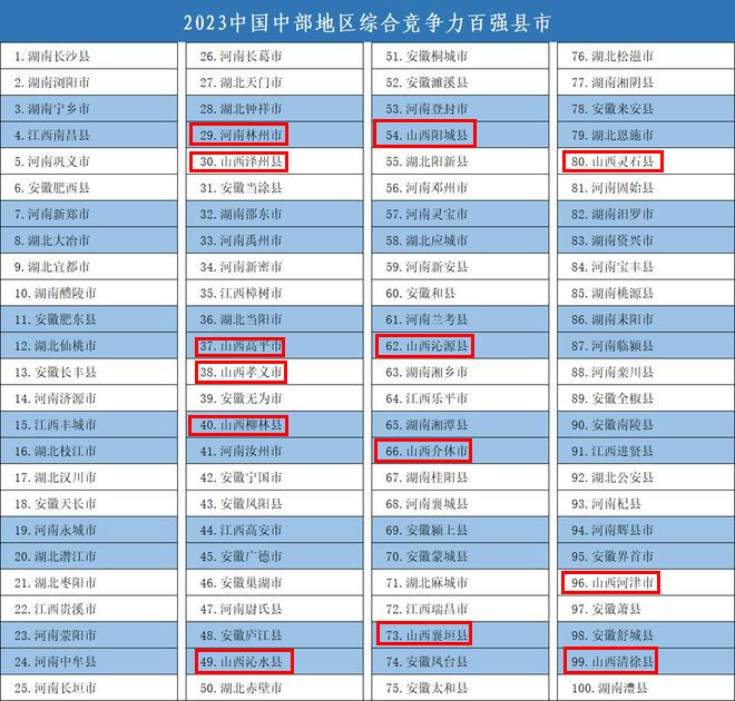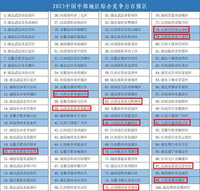 近日,,揭曉“2023中國綜合競爭力百強縣市”等名單,太原市清徐縣入圍“2023中國中部地區綜合競爭力百強縣市”,太原市小店區、迎澤區、杏花嶺區、萬柏林區、尖草坪區入圍“2023中國中部地區綜合競爭力百強區”。