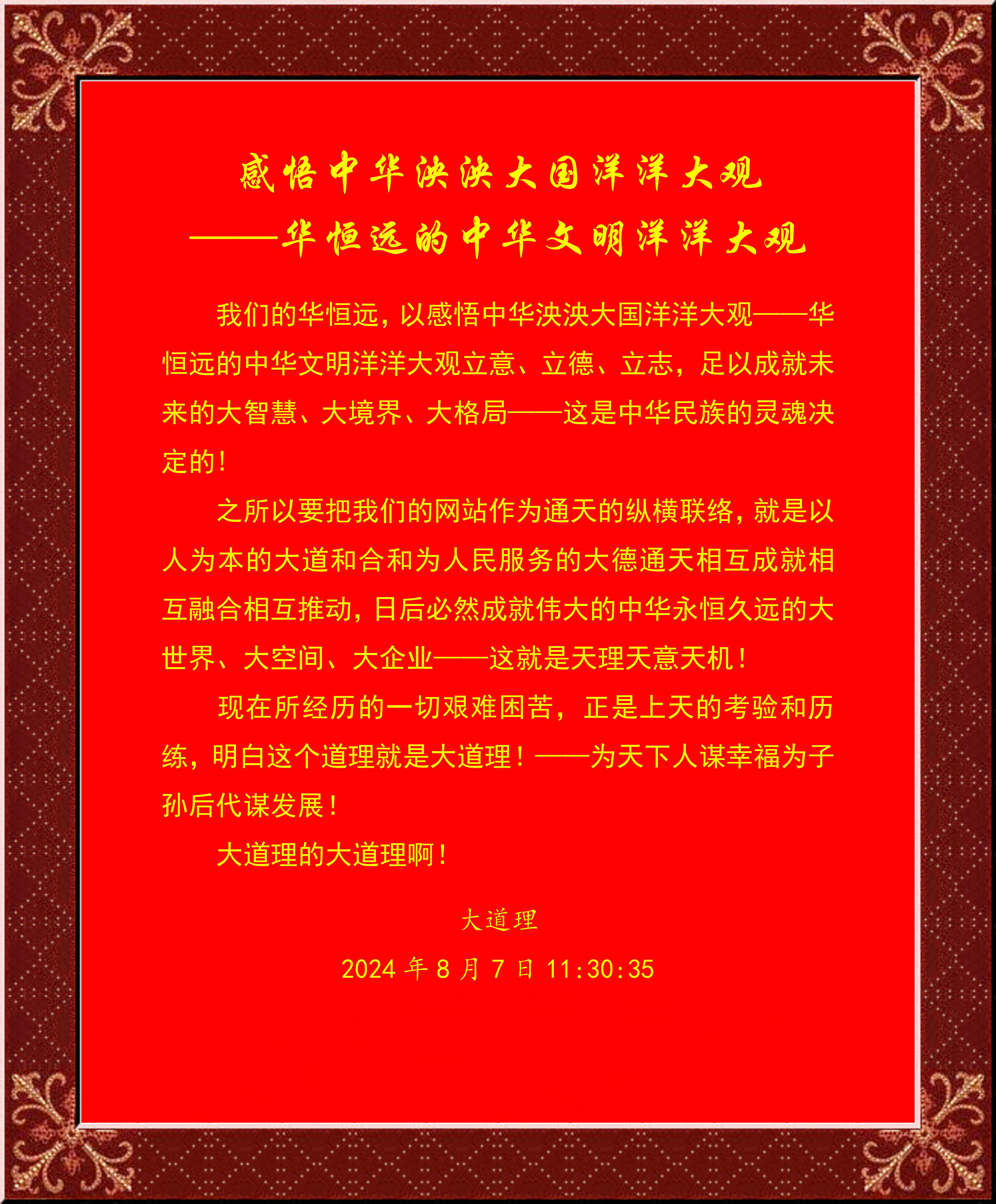 我們(men)的(de)(de)華(hua)恒遠,以(yi)感悟中華(hua)泱(yang)泱(yang)大國(guo)洋洋大觀——華(hua)恒遠的(de)(de)中華(hua)文明洋洋大觀立意、立德(de)、立志,足以(yi)成就未來(lai)的(de)(de)大智(zhi)慧、大境界、大格(ge)局——這是中華(hua)民族的(de)(de)靈(ling)魂決定的(de)(de)!