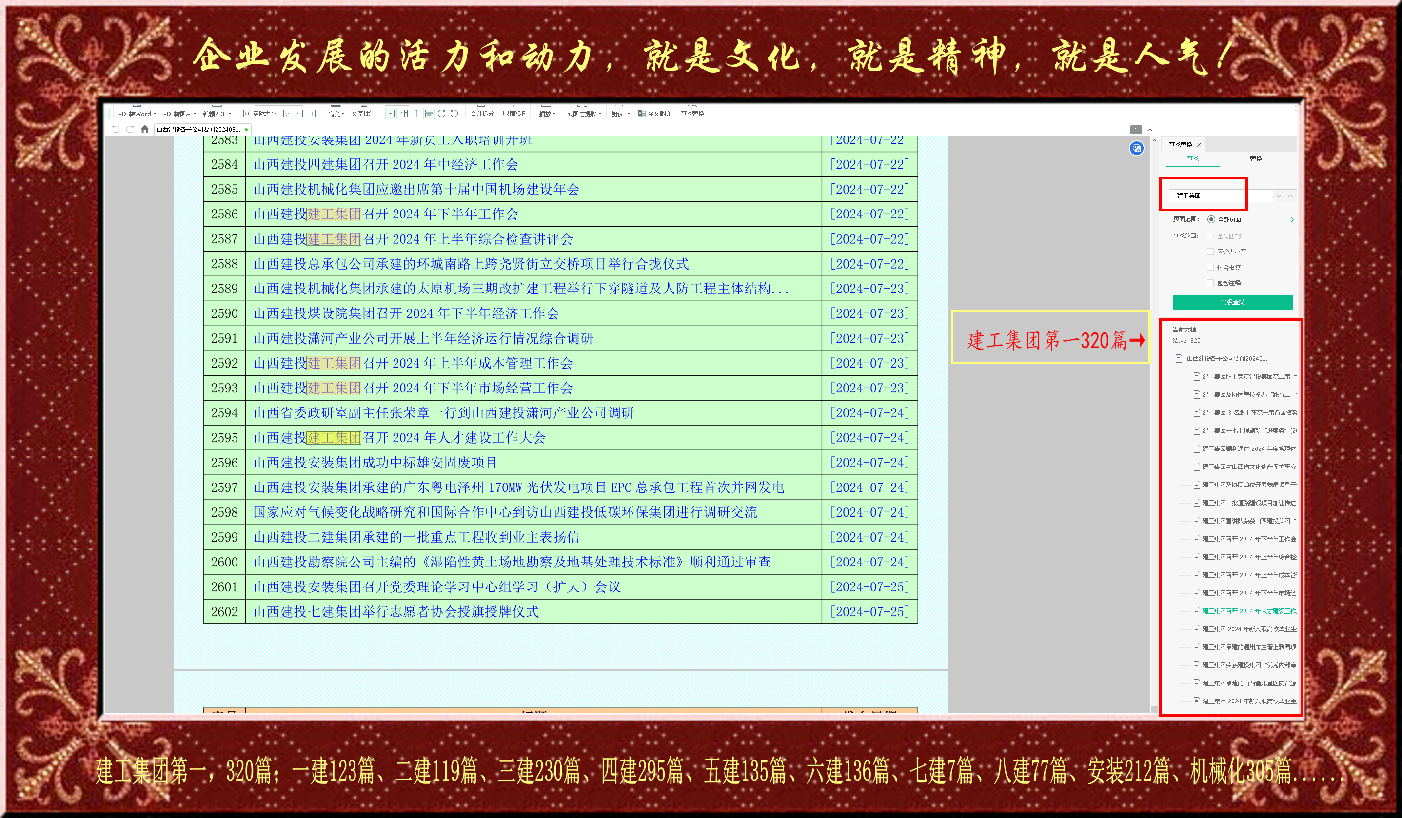 觀察一個企業綜合素質,最簡單也是最直觀的辦法就是看他的信息發布量和信息內容,這是多年來我的體會。企業發展的活力和動力,就是文化,就是精神,就是人氣!我把2669篇文章標題和摘要用PDF格式匯總在一張表格里,便于統計各公司報送母集團公司的信息數量。建工集團第一,320篇;一建123篇、二建119篇、三建230篇、四建295篇、五建135篇、六建136篇、七建7篇、八建77篇、安裝212篇、機械化305篇......
