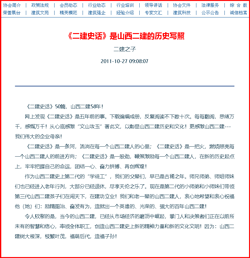 對山西三利裝飾集團有限公司印象深刻,是2011年我撰寫《二建史話》是山西二建的歷史寫照一文,被三利集團網站收入《美文欣賞》欄目之中。