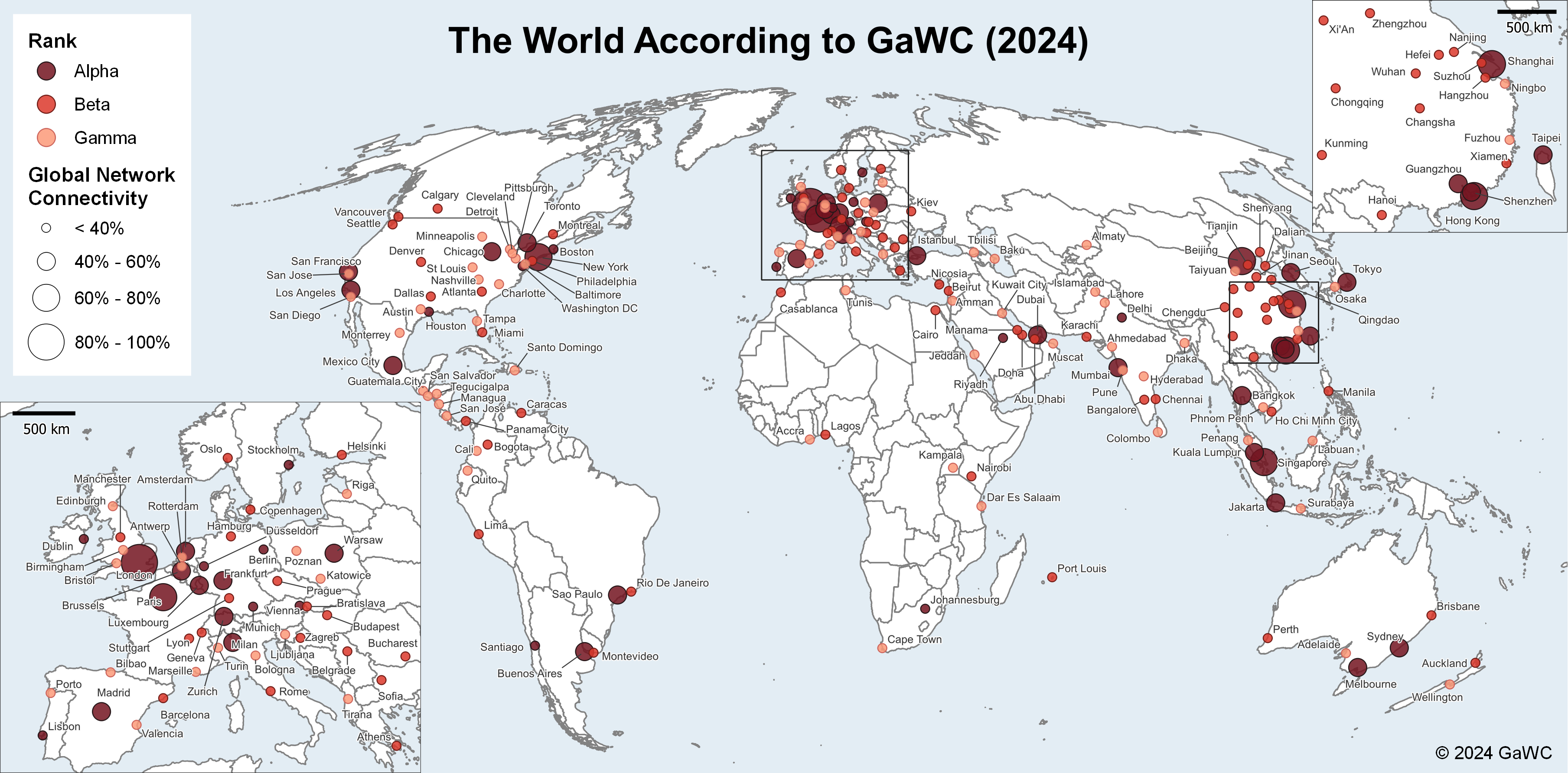 Alpha++ 城市(shi)在所有(you)分(fen)析中,倫敦和紐約明(ming)顯比所有(you)其(qi)他城市更加一體化(hua),并且構成了(le)它們自己(ji)的(de)高一體化(hua)水平。