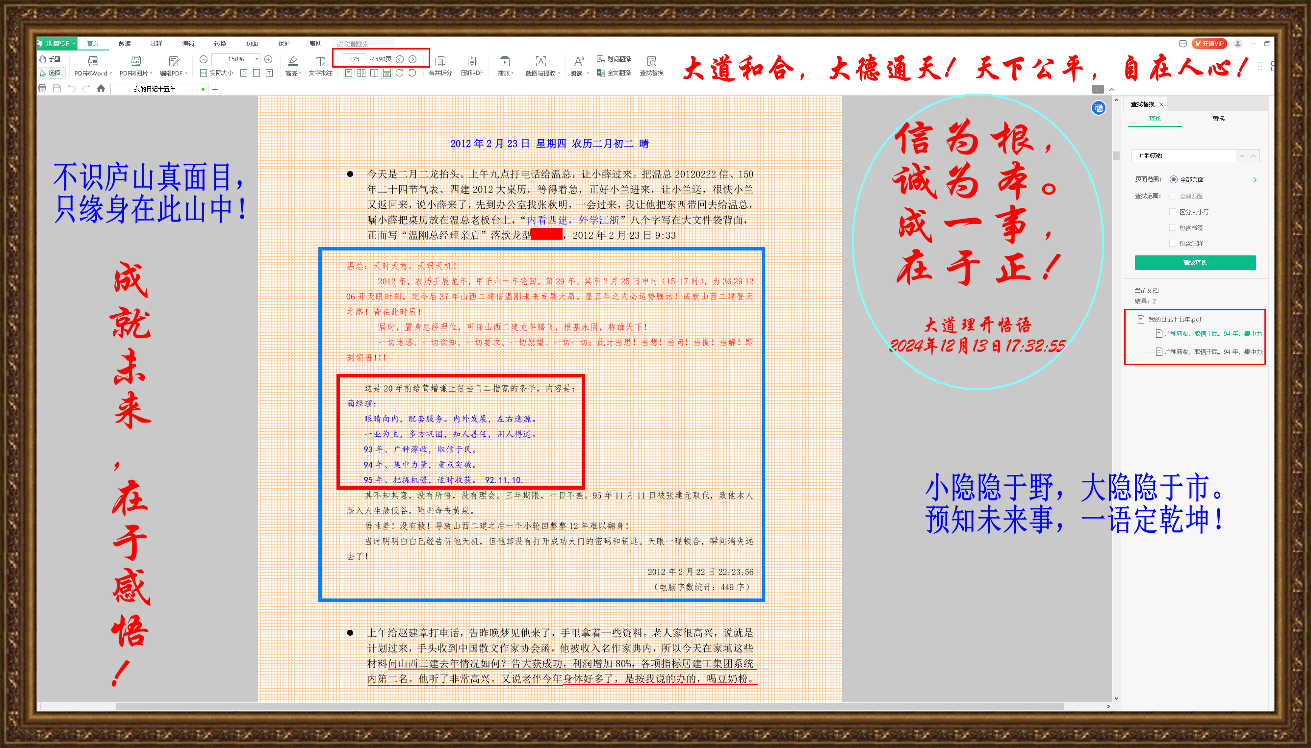 剛才查閱日記,查找《感悟三十年前的一件往事——感應達到靈性的升華》這篇文章,這是寫給二建掌門人的一封信中的內容。那年正好六十歲,也是龍年,被正式聘為總經理顧問,這在二公司是一件暴炸性的新聞,尤其是2011年1月5日第一次與掌門人會悟后的第二天,我的名字在單位全體干部大會上讓所有參會人感到驚訝!就連內弟女兒分公司經理都對她說,你大姑父太厲害了,溫總在大會上講,此人真是他從未見過的高人,我所有的困惑和難題,人家全都給了解疑答惑,一篇文章就能改變我的決定改變山西二建的命運!贊揚恭敬之意不絕于耳,更讓以前認識他的人頗感神奇!趁著熱議,孩子告訴她的經理:!