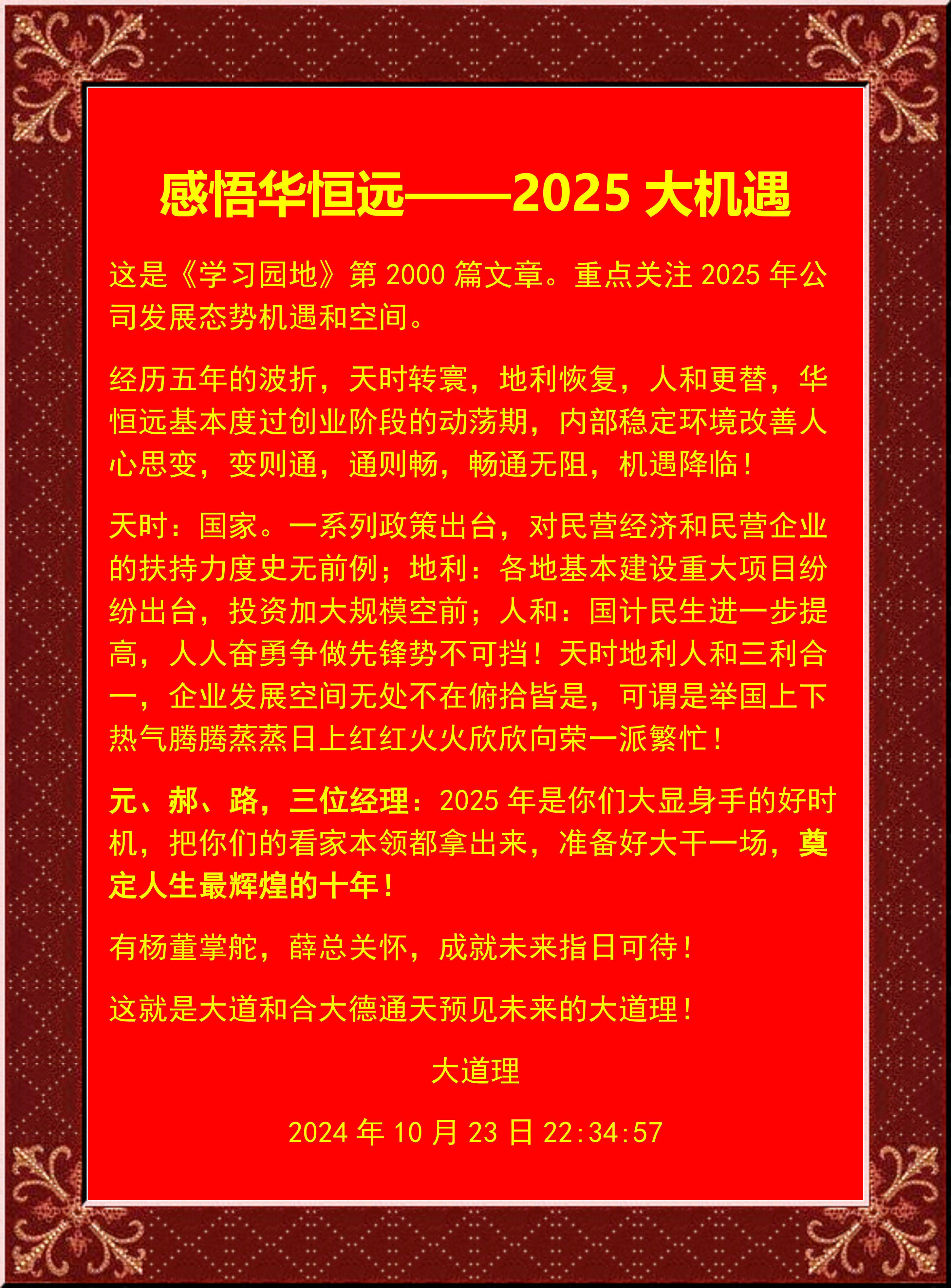 去年3月30日會晤,現在公司中任職有六人,其余四人為公司外圍發展戰略和未來的自家人。今年最大的收獲,是蘇女士張先生夫婦成為華恒遠成就未來大空間永久的戰略合作伙伴!這就應驗了十三這個吉祥如意人氣數,與我們公司名稱相輔相成的還有太原華盛達軟件科技有限公司和山西富新廣建達建材有限公司,三(san)(san)個十三(san)(san)相加三(san)(san)十九,就是天機!