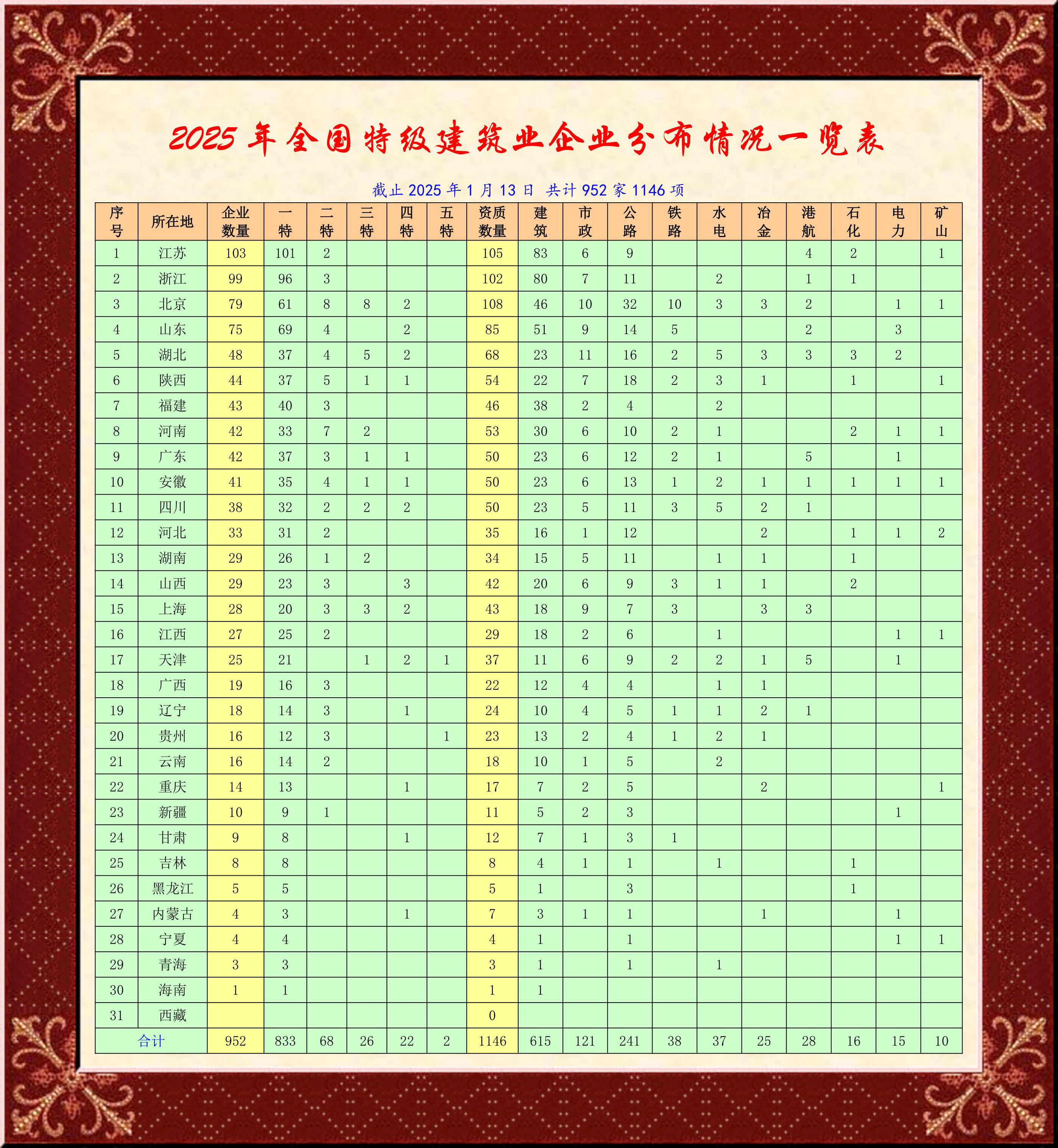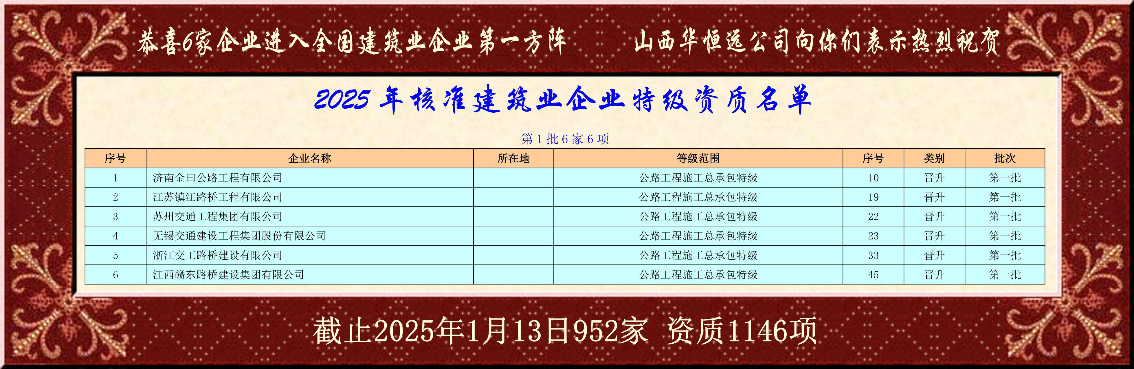 在2025年(nian)新春佳節即(ji)將到來之(zhi)際,今天(tian)住建(jian)部公(gong)(gong)告了(le)今年(nian)核準第一批(pi)建(jian)筑業(ye)企業(ye)資(zi)質(zhi)(zhi)(zhi)名單,其中6家企業(ye)晉升(sheng)公(gong)(gong)路工程總承包特(te)級資(zi)質(zhi)(zhi)(zhi)。江(jiang)(jiang)蘇3家、山東、浙江(jiang)(jiang)、江(jiang)(jiang)西各一家。至(zhi)此全國(guo)特(te)級資(zi)質(zhi)(zhi)(zhi)企業(ye)952家,擁有資(zi)質(zhi)(zhi)(zhi)1146項。