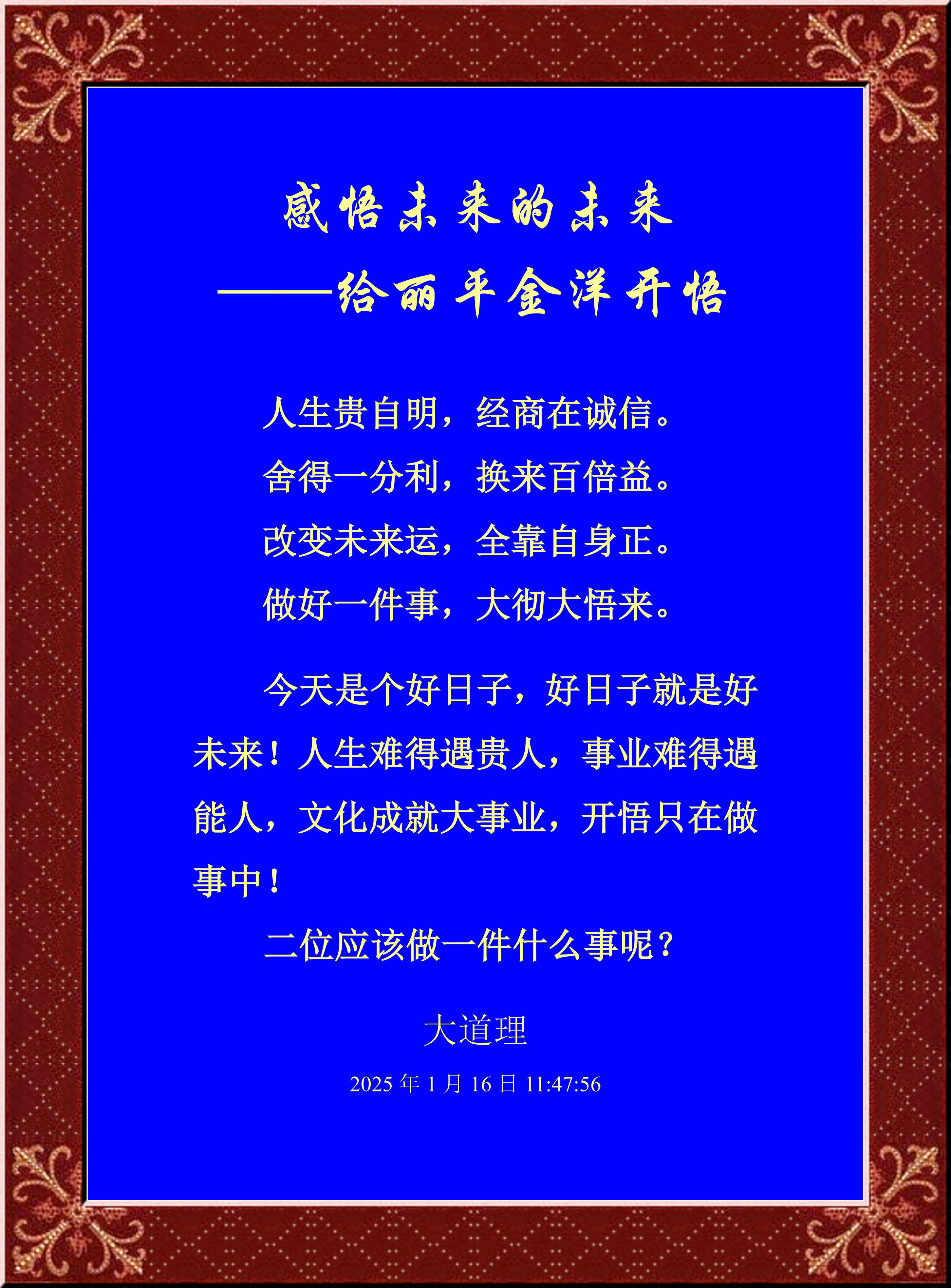今天是個好日子,好日子就是好未來!人生難得遇貴人,事業難得遇能人,文化成就大事業,開悟只在做事中!