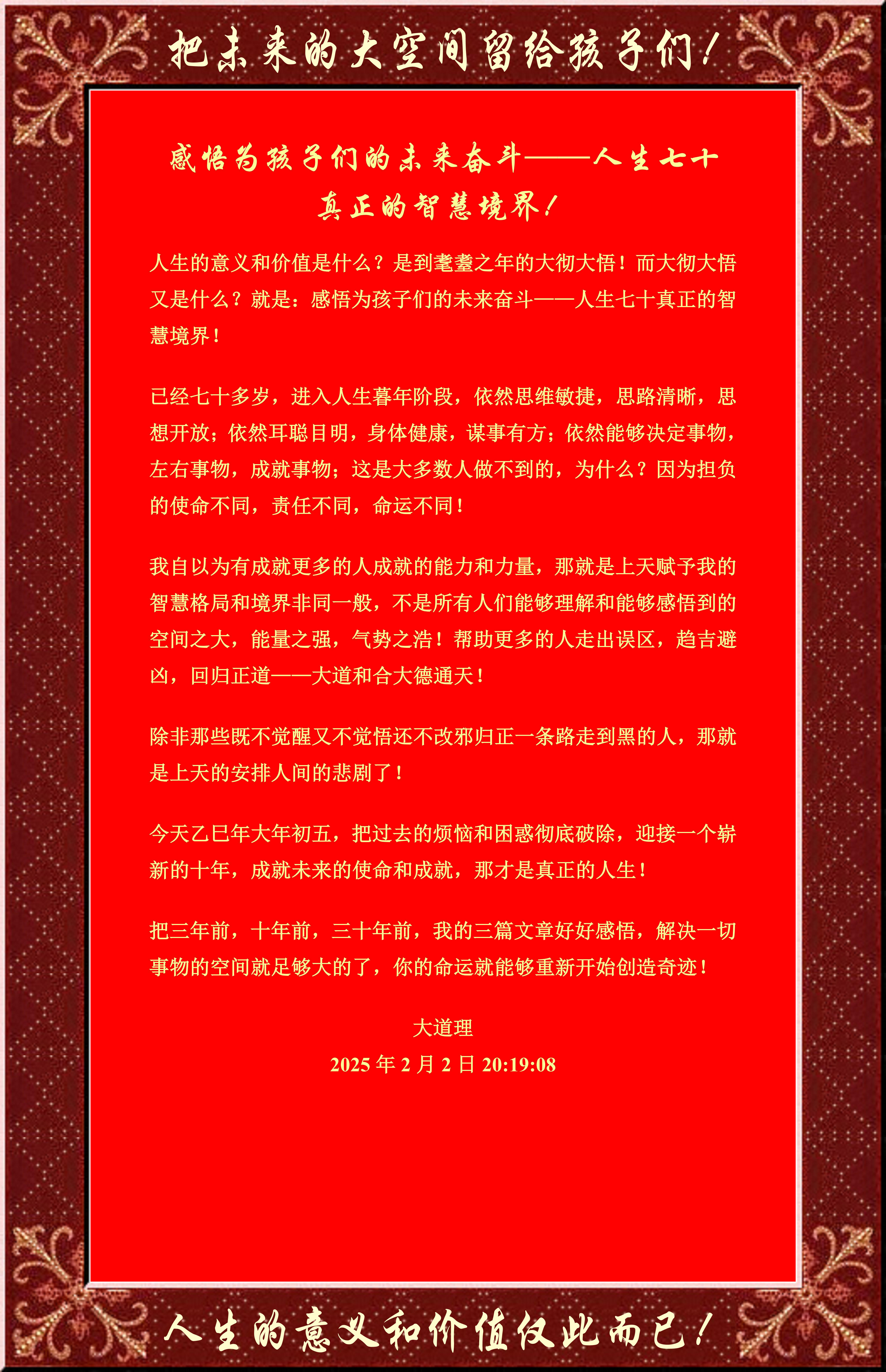 人生的意義和價值是什么?是到耄耋之年的大徹大悟!而大徹大悟又是什么?就是:感悟為孩子們的未來奮斗——人生七十真正的智慧境界!