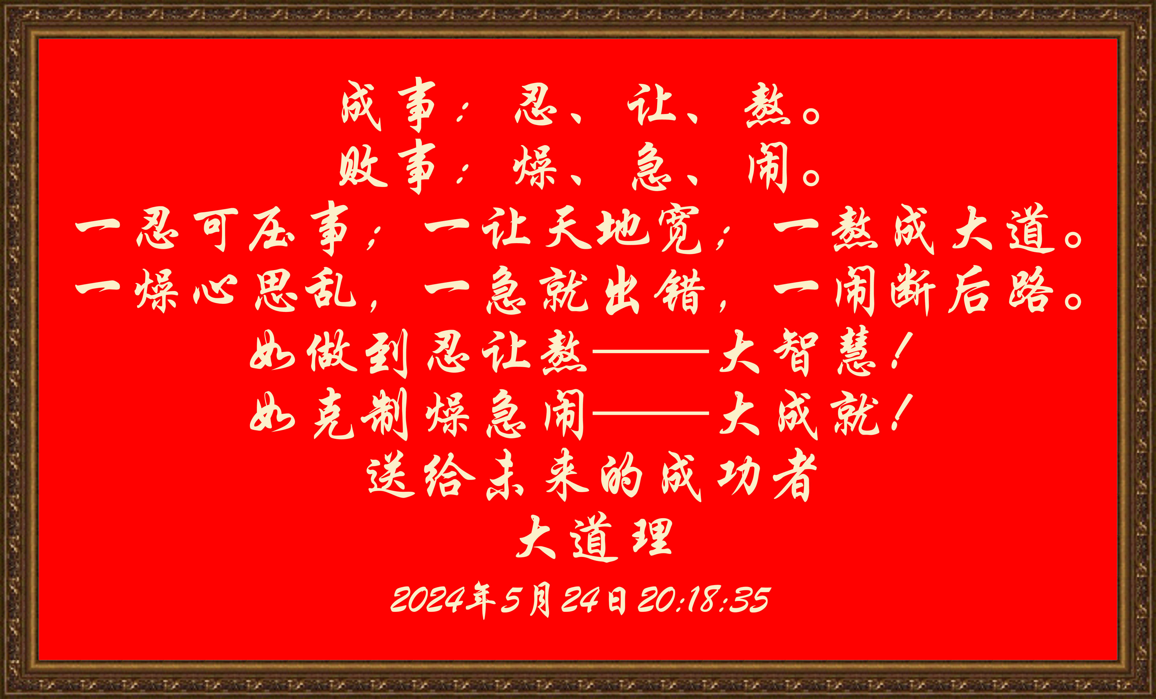 熬(ao)是信(xin)心,讓是智慧,忍(ren)是境界!成就人生事業的天機(ji)就在于忍讓熬三字之中,就在于(yu)勤實儉(jian)三悟(wu)空間之(zhi)內!