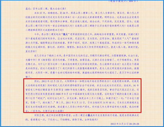 因此,2012年12月23日,太陽照樣會一如既往地升起在世界的東方!這就是根本規律,這就是大自然的自然現象!到時候杞人憂天的所謂瑪雅預言會不攻自破,并且從此成為歷史笑談。說起來,91年曾經有人和我打賭諾查丹馬斯預言1999年地球大爆炸,我的態度是否定的,事實印證只是泛泛之論。還有巴西大預言家朱瑟里諾說2008年9月13中國海南發生毀滅性大地震,當時我在下載的這篇文章上批注兩個紅字“胡說!”,時間過去幾年了,并無此事。倒是去年三月十日晚上,和妻子說了一句:。”第二天,2011年3月11日,當地時間14時46分,日本東北部海域發生里氏9.0級地震并引發,造成重大人員傷亡和財產損失。