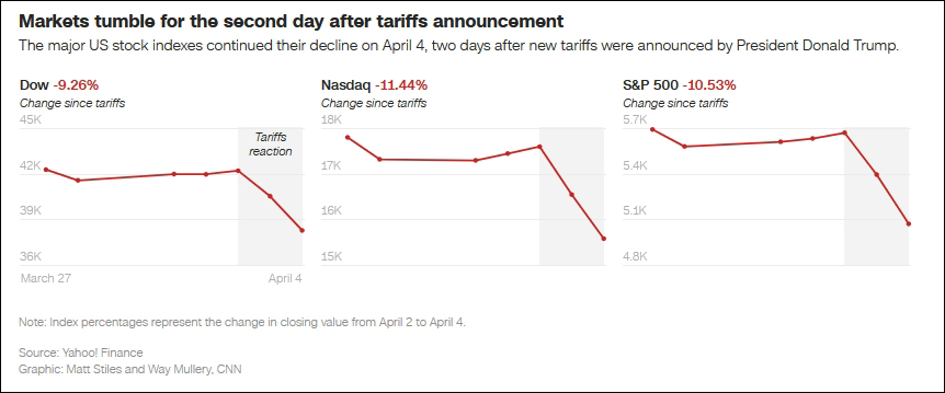 特朗普宣布關稅以來,美股三大指數大幅下跌 CNN制圖(tu)