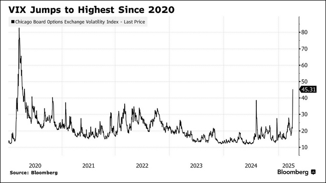 “關稅焦慮席(xi)卷華(hua)爾街”,CNN稱,雖然美國當天(4日)發布的就業(ye)增長數(shu)(shu)據超出預期(qi)(qi),但關稅焦慮依然主導市場(chang)情緒(xu)。芝加哥期(qi)(qi)權交(jiao)易所(suo)(Cboe)波動率指(zhi)數(shu)(shu)(即VIX“恐慌指(zhi)數(shu)(shu)”)暴漲50%,飆升至45以上,達2020年以來最高點。