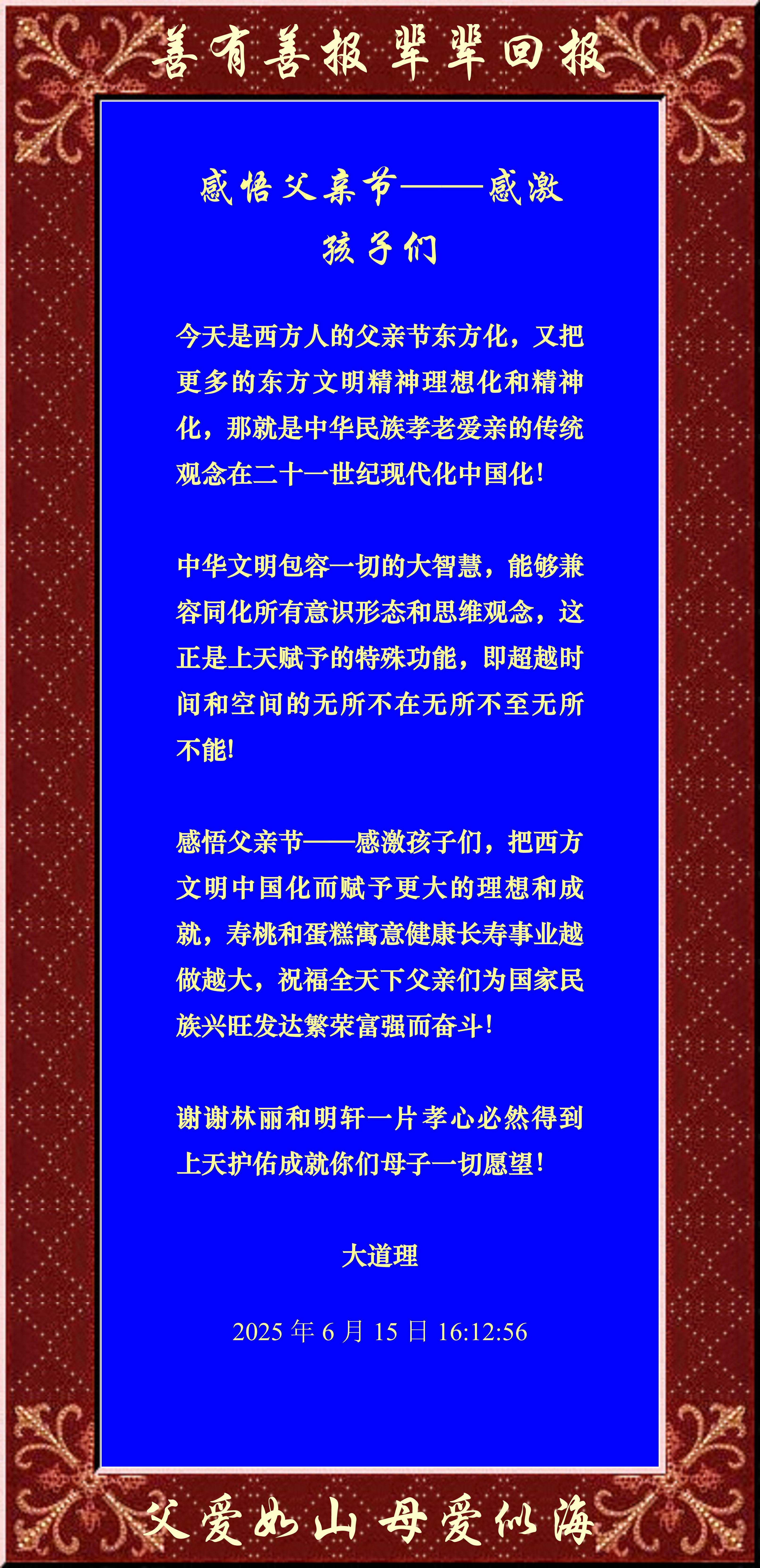 感(gan)悟父親節(jie)——感(gan)激孩子們,把西(xi)方文明中國化而(er)(er)賦予更大(da)的理想和成(cheng)就,壽(shou)桃和蛋糕寓意(yi)健康長壽(shou)事(shi)業越(yue)做越(yue)大(da),祝福全(quan)天下父親們為國家民族興旺發達繁(fan)榮富強而(er)(er)奮斗!
