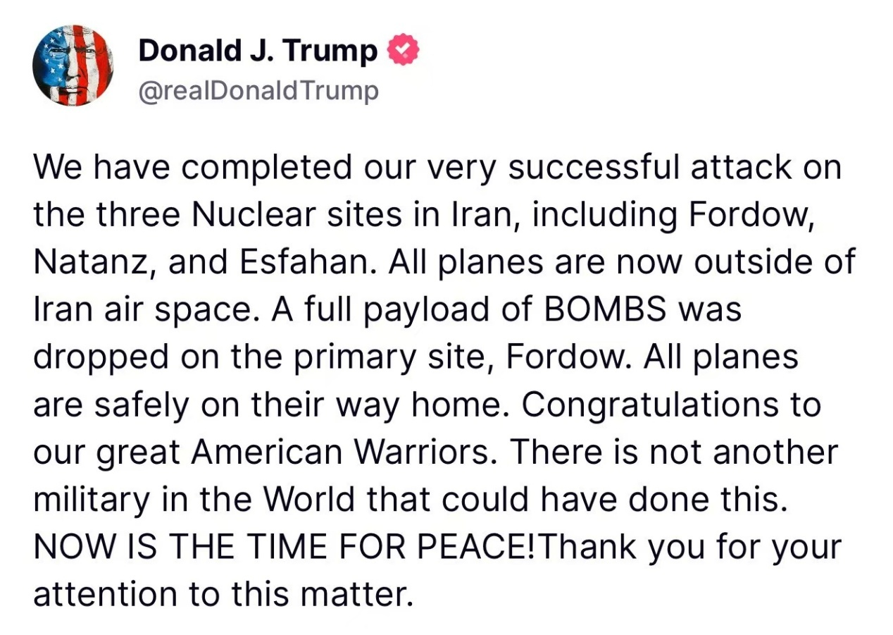 6月17日,他宣稱伊朗“希望達成協議”,但“為時已晚”,并在社交媒體發帖暗示伊朗“無條件投降”。