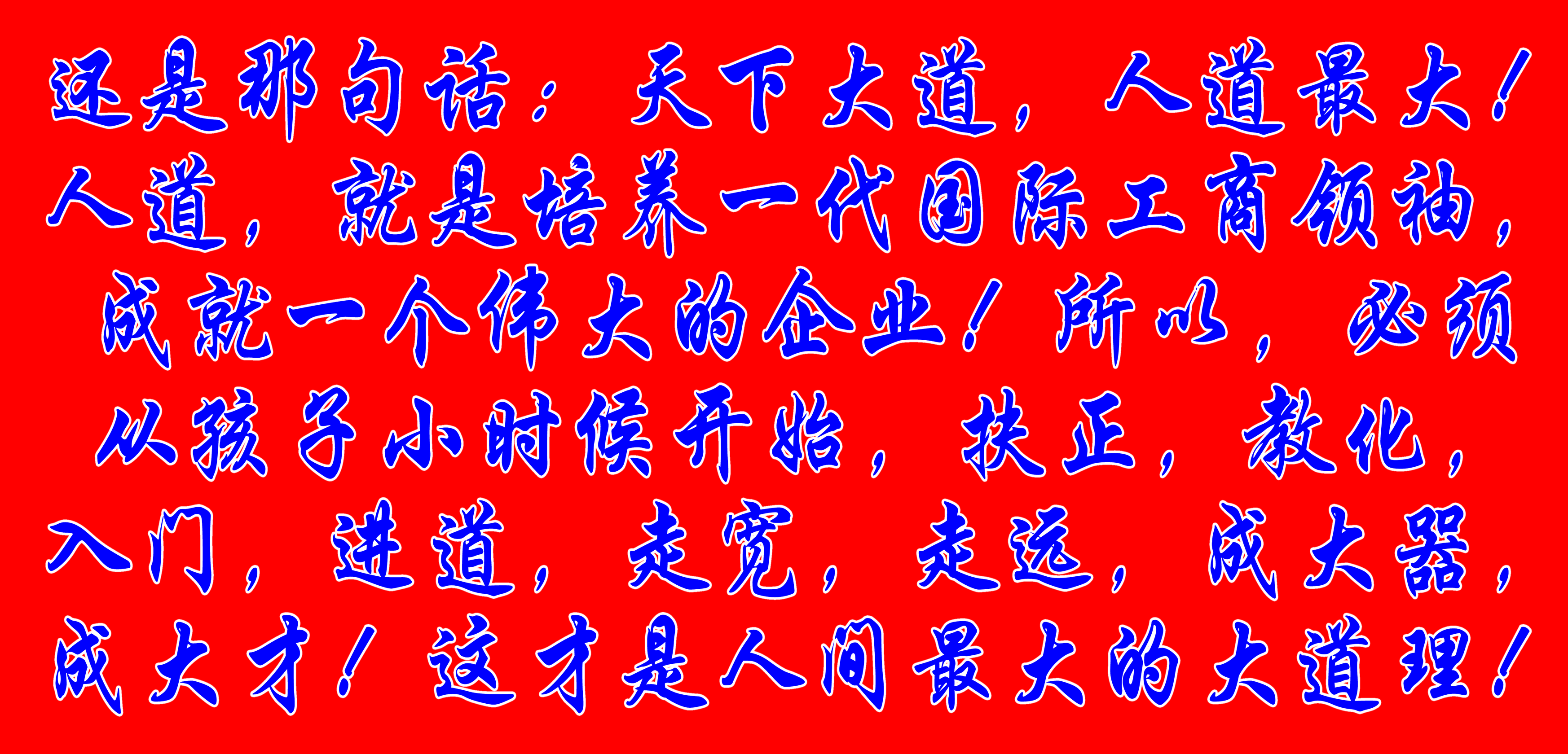 還是那(nei)句話:天(tian)下大(da)道(dao),人道(dao)最大(da)!人道(dao),就是培(pei)養(yang)一代國際工商領袖,成就一個偉大(da)的(de)企(qi)業!
