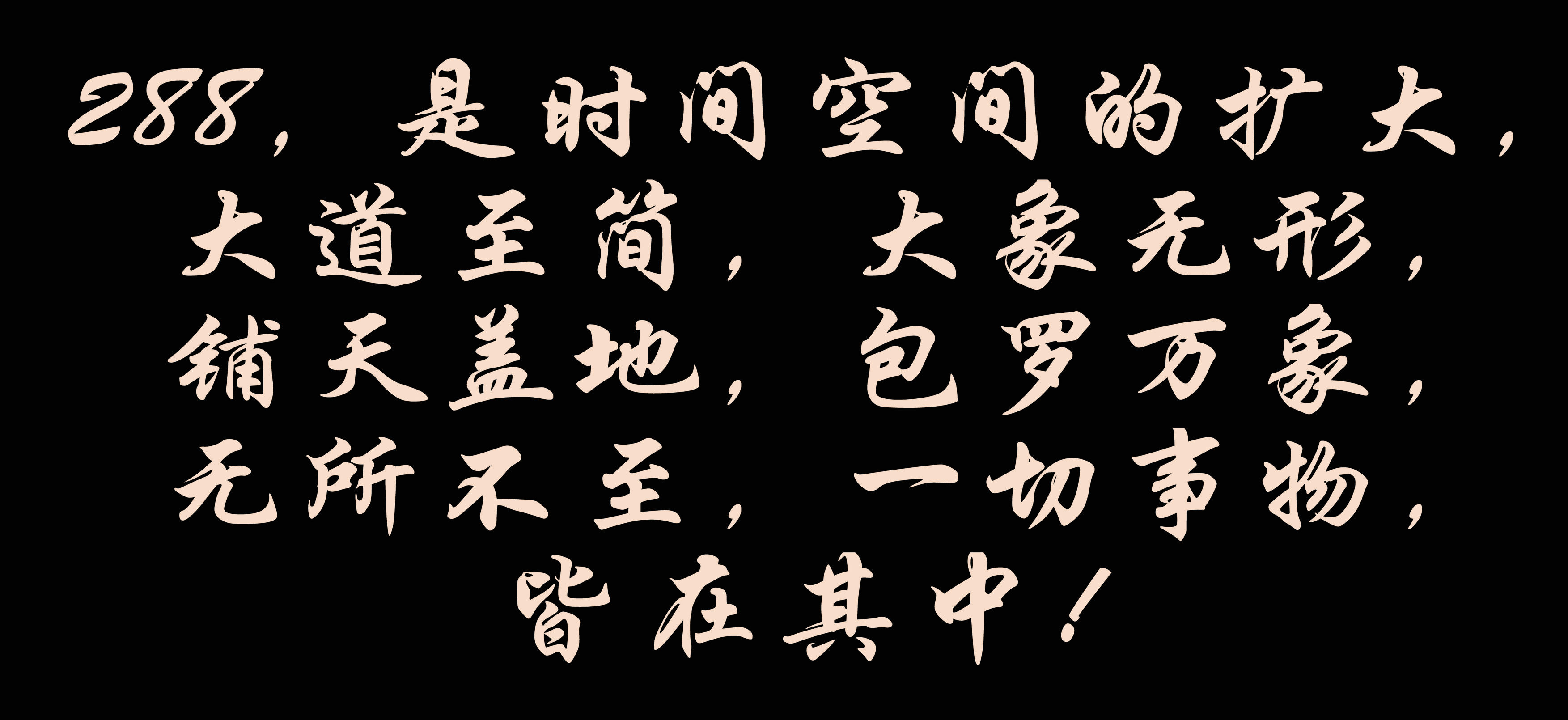 288,是(shi)時間空間的擴大,大道(dao)至簡,大象(xiang)無(wu)形,鋪天蓋地,包(bao)羅萬象(xiang),無(wu)所不至,一(yi)切(qie)事物,皆在其中!