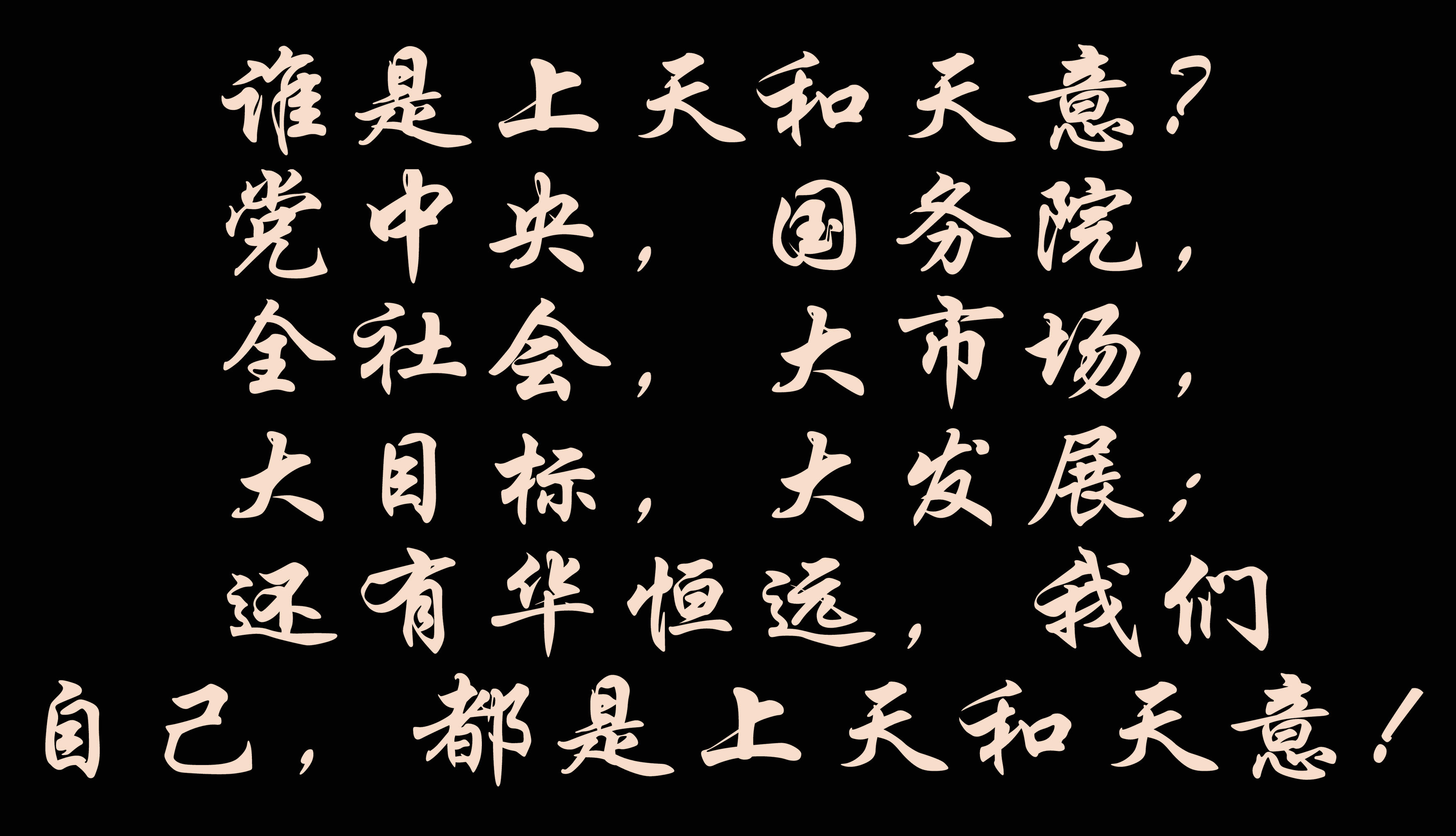 誰(shui)是上天(tian)和天(tian)意(yi)?黨中央,國務(wu)院(yuan),全社(she)會(hui),大(da)市場,大(da)目標,大(da)發展;還有華恒遠,我(wo)們(men)自(zi)己,都是上天(tian)和天(tian)意(yi)!